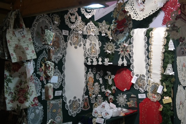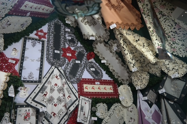 걸려있는 종류만도 족히 백 가지는 되어 보이는 자수무늬 식탁보 및 장식보 들은 비록 나의 취향은 아니지만 그 섬세함과 독특한 디테일에 입이 다물어지지 않는다. 식탁보, 테이블 보뿐 아니라 창걸이, 크리스마스트리 장식품까지도 취급하는데 점원이 젊은 여인이라 깜짝 놀랐다. 여인은 점포에서 앉았다 일어났다 사람들의 질문에 답변하고 작품들을 소개하면서도 쉼 없이 바느질을 하고 있었는데 그 모습은 여태껏 내가 크리스마스 마켓에서 본 모든 장인 중 가장 우아했고 바늘 하나와 손기술만으로 새로운 세상을 직조해 내는 진정한 조물주처럼 보였다. 역시 사고 싶었지만 크리스마스날 저 아름다운 식탁보를 깔고 질질 흘리고 먹는 우리 집 다 큰 애들을 보면 멱살을 잡게 될 것 같아 참았다. 우리 식구가 평화롭게 식사하는 것이 아름다운 크리스마스를 보내는 것보다 조금 더 중요하기에...