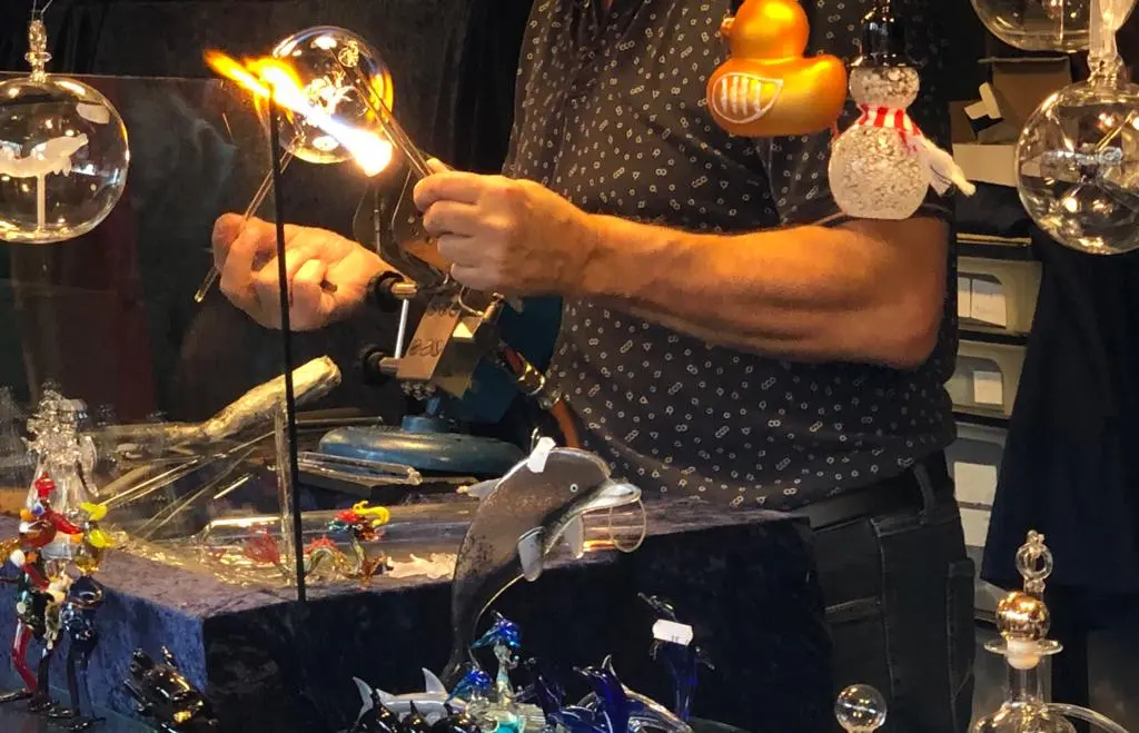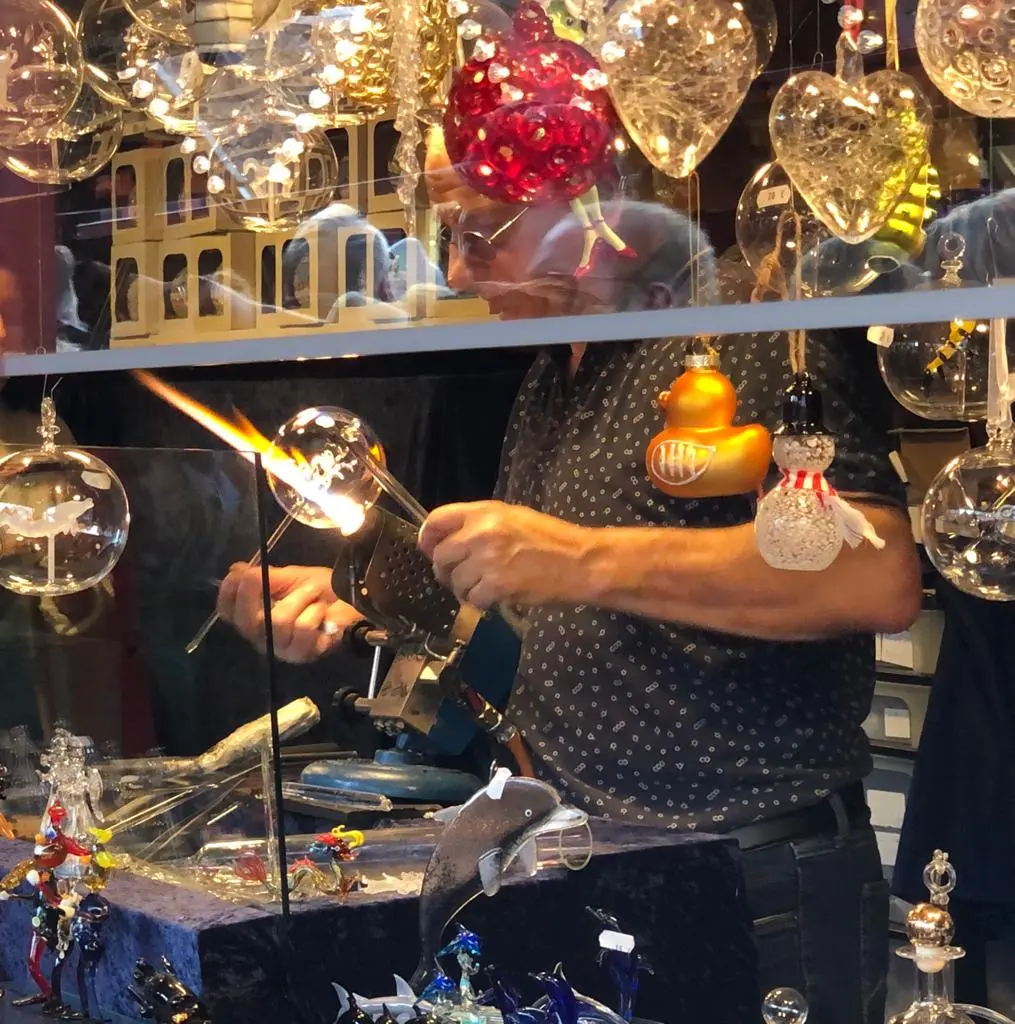 셀 수 없이 많은 작품들을 만들어 보았을 유리세공장인은 머릿속에 디자인과 색상 크기 등에 대한 정보가 이미 입력되어 있는 듯하다. 먼저 유리반죽에서 세심하게 이물질이나 스크래치가 난 부분을 제거한 후 첨단(?) 기계에 납작한 막대 사탕 모양의 조각을 끼워 뿜어져 나오는 불을 쏘이며 이리저리 굴려가며 가열한다. 다른 색이 필요하면 색이 있는 유리막대를 스르르 갔다 대기만 하면 된다. 눈 깜짝할 사이에 기계의 대롱에서 공기가 주입되면서 동그랗게 몸집이 불어 오르면서 예쁜 공모양의 장식품이 탄생한다. 공이 만들어지는 과정도 신기하지만 뜨거운 유리반죽 덩어리에서 핀셋 하나만으로 다리를 잡아끌고 머리를 잡아당기고 하여 마치 조물주가 생명을 만들어내듯 순식간에 가지가지의 동물 모양 크리스마스 장식을 탄생시킨다. 베네치아의 유리 세공으로 유명한 무라노섬에서 수공예 공장을 방문했을 때도 장인들의 숙련된 손놀림과 창의성에 크게 놀란 적이 있었다. 예술못알로서 단순한 비교를 하자면 이태리 무라노의 장인들은 대롱에 직접 입을 대고 불어가며 고대기술을 그대로 사용하면서 매우 세련되고 정제된 손놀림으로 예술작품을 만들어내지만 크리스마스 마켓의 독일 유리 세공 장인들은 기능이 훨씬 다양한 혁신적 손기계(대량 생산을 위한 기계는 아니다)를 다루는 능력과 정확성을 갖춘 엔지니어적 기술을 자랑한다 하겠다. 어느 쪽이든 대단하기는 마찬가지지만 이 귀한 구경들을 동네서 공짜로 시켜주는 크리스마스 장인들께 조심스레 한 표를 더 드린다.