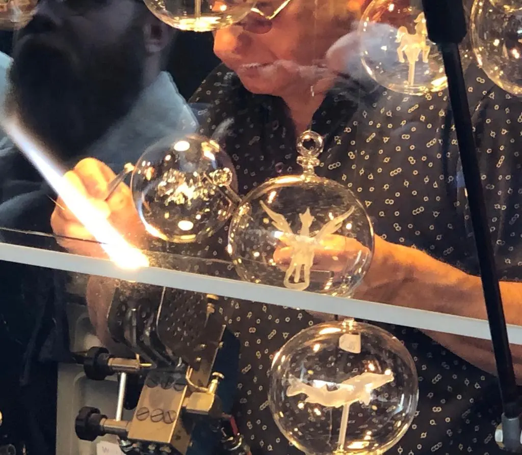 대량생산으로 마구 찍어내는 예쁘고 화려한 크리스마스 장식은 널려 깔렸지만 장인이 직접 눈앞에서 제작하는 유리 장식을 만드는 것을 볼 기회는 많지 않다. 궁색한 변명을 하자면 유리 마법사를 가까이 보고자 하는 사람들이 장사진을 치고 있는 바람에 사진 찍기가 무진장 힘들었다. 우리 집 아저씨 등을 떠밀어 인산인해를 이루고 있는 사람들의 머리통 사이에 카메라를 들이대고 셔터를 누르게 시켰더니 사진의 각도와 질이 형편없다. (브런치에 훌륭한 사진작가분들이 많으셔서 매번 이따구의 사진을 올릴 때마다 송구스럽다.)