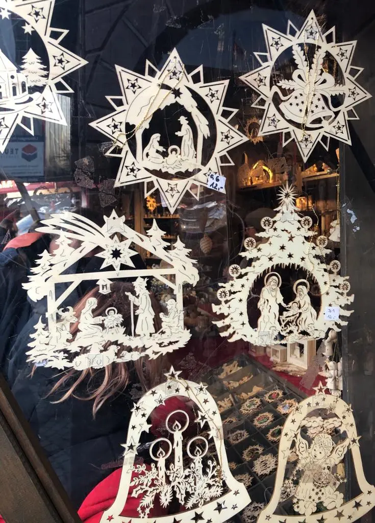 나무공예품 가게에는 크리스마스 트리에 다는 장식품, 촛대, 천사, 예수, 마리아 등의 성상부터 미니어처 가구까지 장식품의 종류가 다양한데, 갖가지 나무로 된 장식을 구경하는 것도 즐겁지만 점포 바로 옆에는 유리로 된 작업장이 있어서 이 장식품들이 어떻게 만들어지는지를 관찰할 수 있게 되어있다. 은은한 조명과 함께 나무향이 가득 펴져 있는 작업대 위에는 나무 조각들이 널브러져 있다. 여기에서는 소나무로 보이는 원목을 톱으로 절단하는 작업에서부터 나무조각을 부드럽게 다듬고 조각하는 과정을 모두 볼 수 있는데 거칠던 나무가 손질되어 순식간에 매끄러운 곡선이 탄생하거나 디테일이 추가되는 장면을 보는 것은 신기방기하다. 눈송이, 천사, 촛불, 예수가 탄생하는 장면 등 다양한 모티브의 장식품들을 가만히 들여다보면 그 세밀함에 정신이 혼미해진다. 나처럼 손재주 없고 디테일이 버거운 사람들에게 장인들은 그저 숭배의 대상이다. 나무 장식 중에 별자리 시리즈가 있는데 올해는 식구별로 별자리 장식 4개를 골라 사서 트리에 매달았다. 별자리 크리스마스 장식이라니, 좀 뜬금없지만 서양에서는 별자리가 혈액형 보다 훨씬 진지하게 받아들여진다. 독일에 올 때까지 내 별자리가 무엇인지도 몰랐던 나는 언젠가 잡지에서 물병자리가 독창적이고 진보적인 사고를 가지며 사회적 이슈에 관심이 많다는 것을 읽고 감동받았다. 그래, 그런 사람이 한번 돼 보자고!