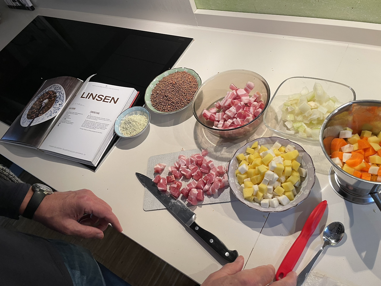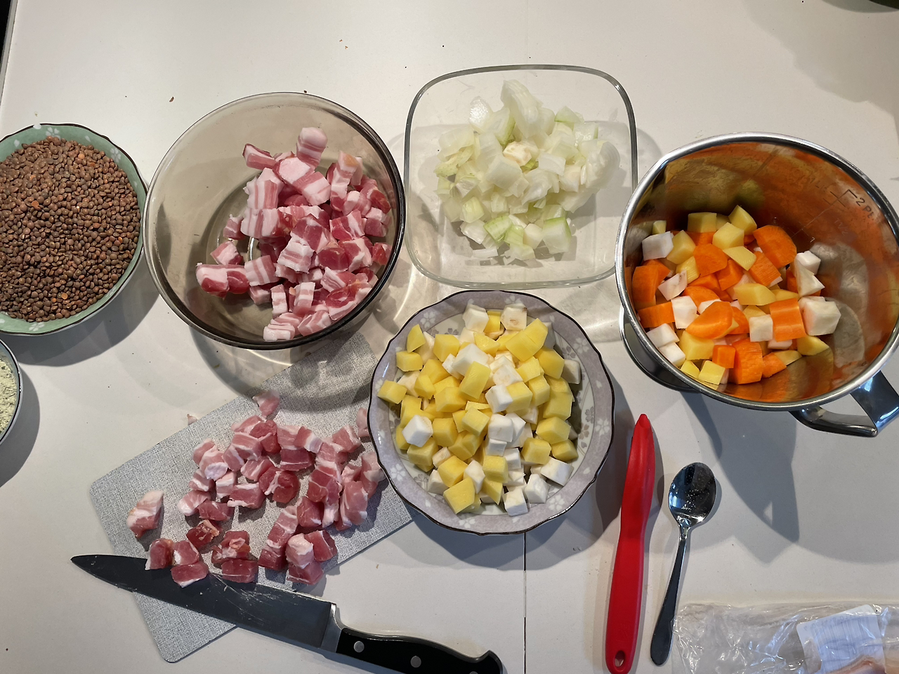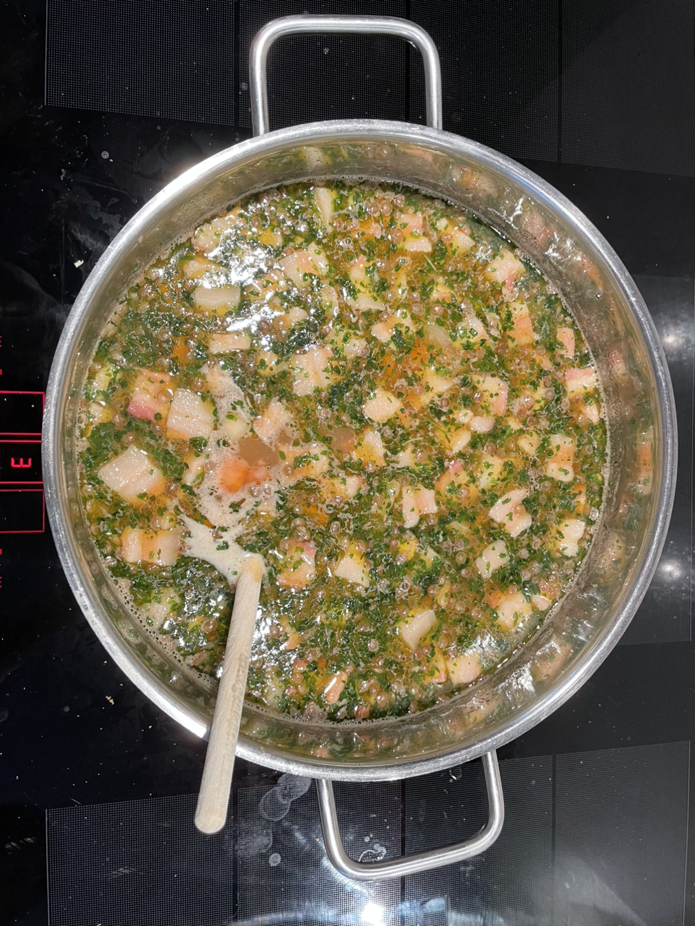 어찌 되었든 깍둑썰기가 다 끝난 각각의 재료들은 대형 냄비 안에서 보글보글 20분을 끓인 후에 고소한 린젠수프로 탄생되었다. 고깃국의 고소함과 퍼지지 않은 린젠콩의 부드러우면서도 오독거리는 식감, 뭉근하지만 재료의 질감이 살아 있는 셀러리 뿌리와 당근, 감자까지... 너무 맛있는 식사가 되었다! 그래, 나는 은퇴한 요리사랑 사는 것이다 (배가 부르면 급속도로 긍정적으로 변하면서 세상이 아름다워 보인다).