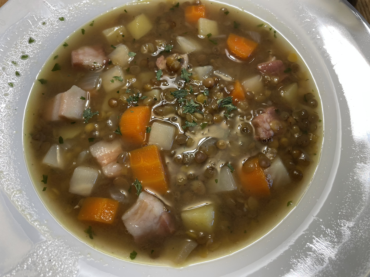 20분만 끓이면 되고, 단백질이 풍부한 데다 겁나게 맛있기까지 한데도 집에서는 잘해 먹지 않게 되는데 중대한 이유는 속에 들어가는 모든 재료들을 다 찹찹찹 칼질해야 되기 때문이다. 재료라 함은 여러 가지 다른 방식으로 만들 수 있겠으나 보통 당근, 감자, 양파, 셀러리악(뿌리), 돼지 뱃살 등인데 이 중 당근과 셀러리 뿌리를 깍둑썰기하다 보면 갱년기 아줌마의 손모가지를 수프 앞에 제물로 바쳐야 한다. 나는 나보다 훨씬 덩치 크고 튼튼한 가족들의 건강에 손목을 바칠 만큼 헌신적인 엄마가 아니기에 사놓은 렌틸콩을 애써 외면하고 있었다. 그러다 작년 마지막 주 (그러니까 며칠 전) 팬트리를 정리하면서 유통기간을 껄떡 껄떡 넘겨가는 렌틸콩 봉지를 발견했다. 사라져 가는 나의 근육들에게 단백질의 근원을 선사하기 위해 구입해 놓고 찹찹찹을 해낼 자신이 없어서 오늘날까지 모셔둔 렌틸콩들을. 그리곤 남편에게 애원했다. 린젠수프를 대령해 내시오.