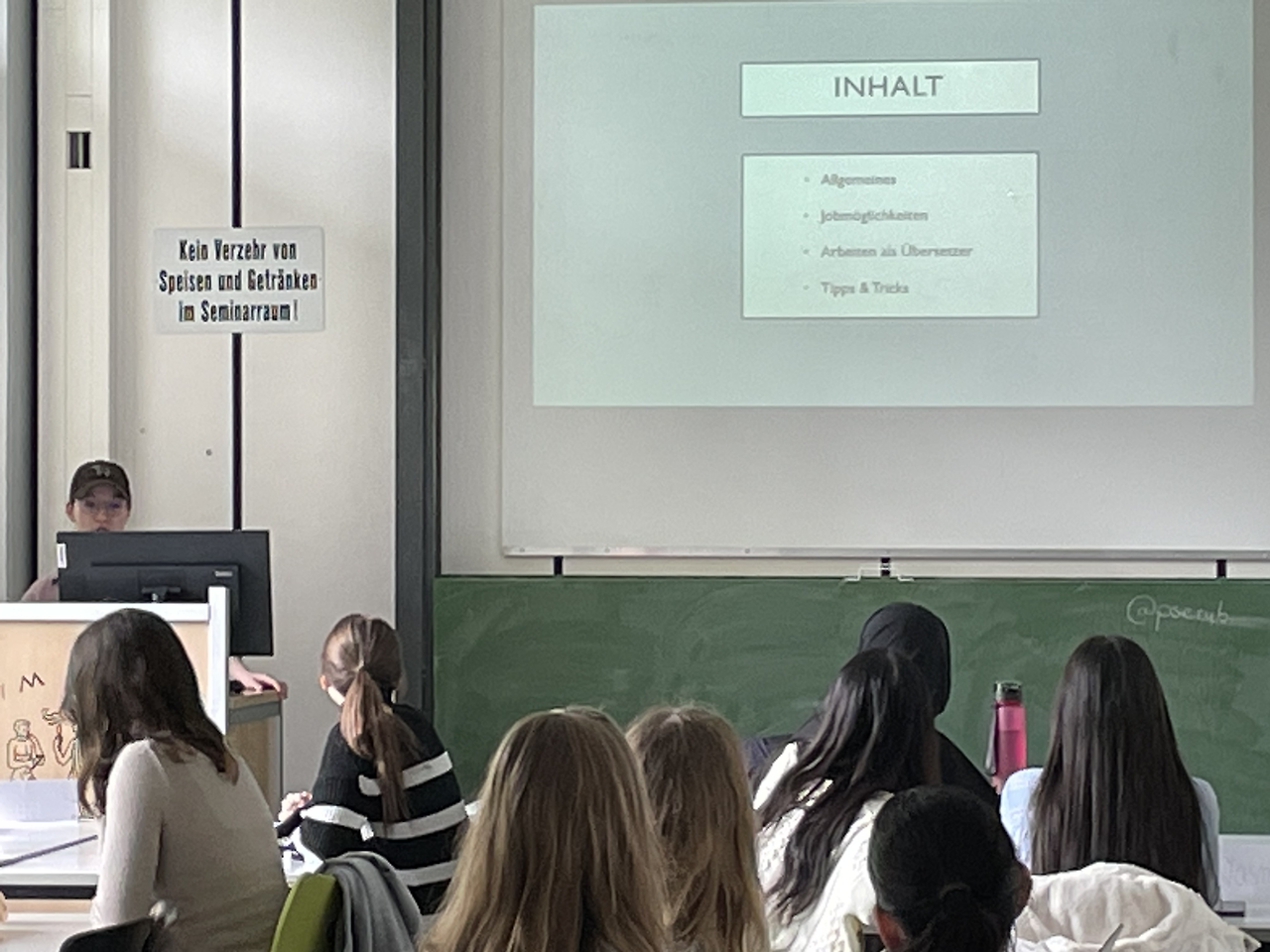 강의를 경청하고 있던 학생들은 여러 가지 질문들을 했다. 번역가의 삶에 대해 구체적으로 묻는 학생도 있었고, 시간 안배라던가 실수가 있었을 때의 어떤 불이익을 당하는지 등 구체적인 작업에 대한 질문도 있었고, 좋아하는 작품을 골라서 번역일을 할 수 있는지 아니면 배당된 작품 모두를 번역하는지의 질문들 흥미로운 질문이 많았다. (개인적으로 가슴이 벅차오르는 순간이었다. 나의 수제자가 번역가가 되어 내 수업에서 다른 학생들에게 자신의 성공 스토리를 전하는 것이… 동시에 내 나이가 벌써? 하는 자각이 들어 살짝 멘붕이 오기도 했다. 질문하는 학생들도 자랑스러웠고 질문에 답하는 알랙스도 자랑스러웠고 선생으로서 벅참의 감정이 바닷가가 수천리 떨어져 있는 독일 중부에서 파도처럼 밀려왔다. 이래서 쥐꼬리 만한 월급을 받으며 수업을 하는 거다.)