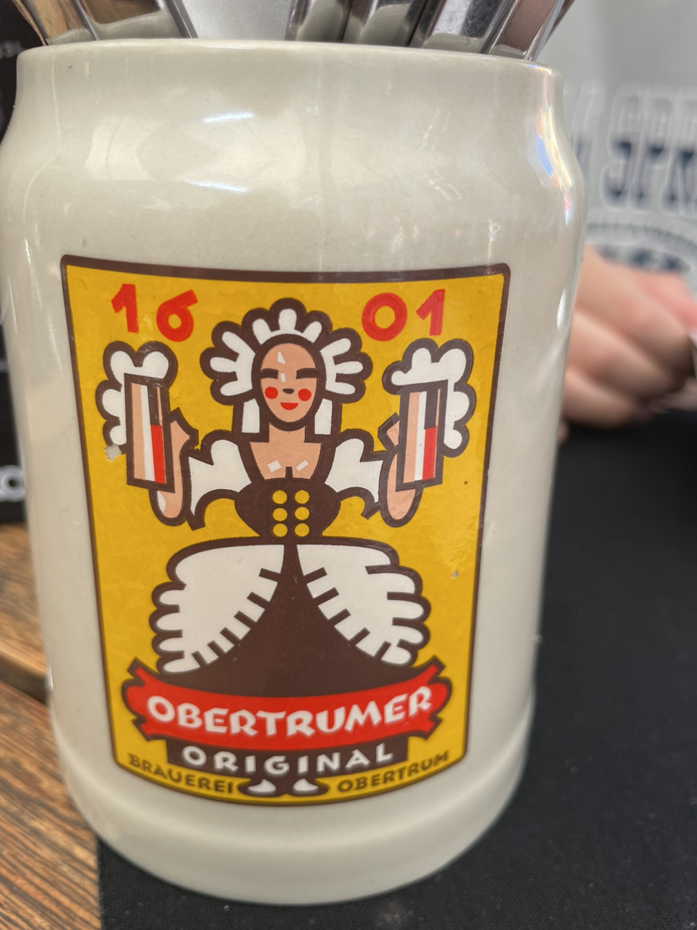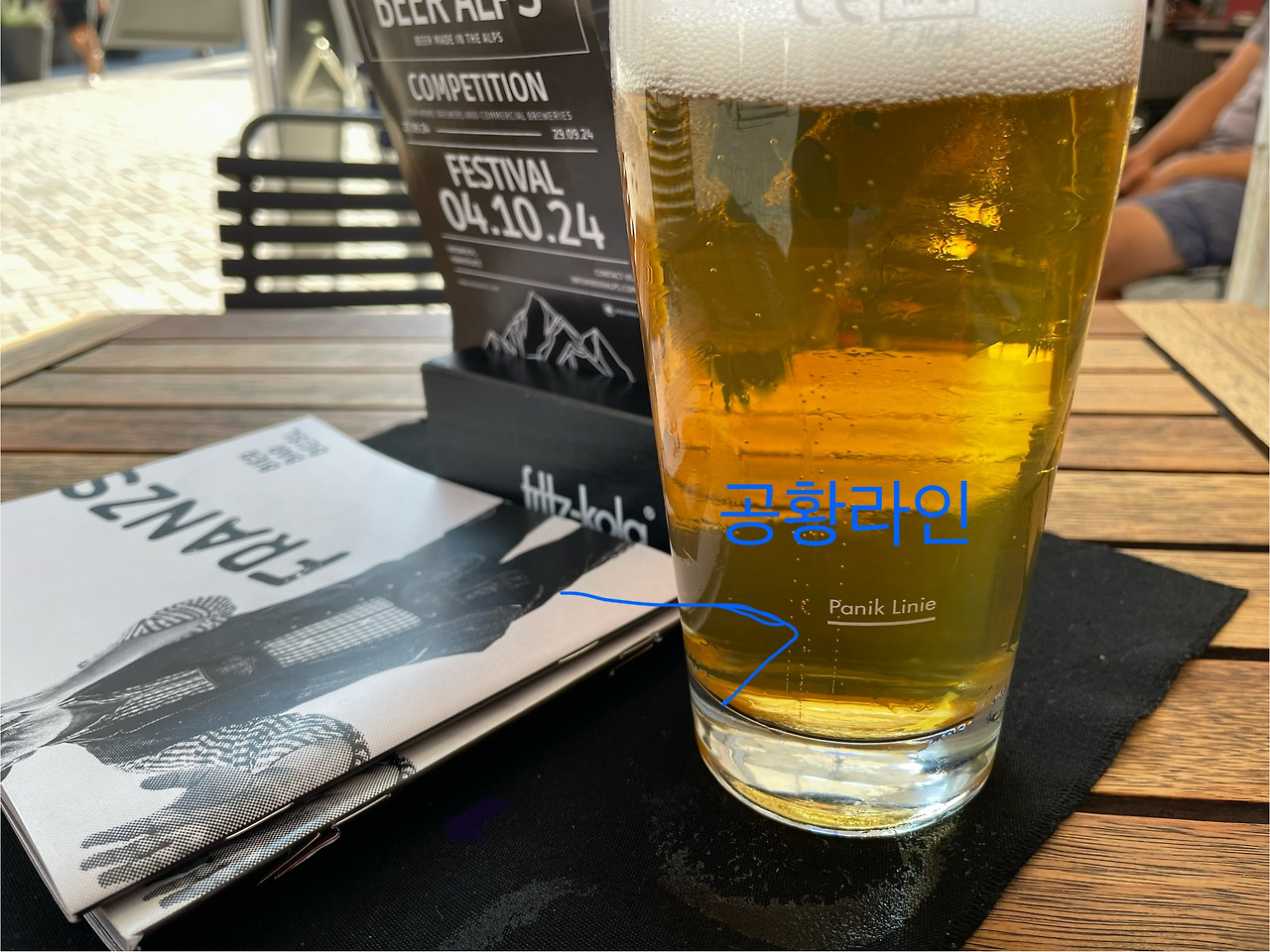 맥주잔들이 예뻐서 물끄러미 쳐다보다 남편이 낄낄댄다. 맥주잔 아래 부분에 금이 그어져 있고 이 라인보다 맥주양이 적어지면 공황에 빠질 것이라 되어 있다 ㅎㅎㅎ 이름하야 패닉 라인! 이 라인에 맥주가 도달하기 전에 미리미리 시켜놔야 한다- 아니면 공황상태에 이르느니. 틀린 말이 아니다. 32도에 에어컨 없이 밖에 앉아 식사를 하며 시원한 맥주가 떨어지면 어찌 음식을 넘길 소랴!