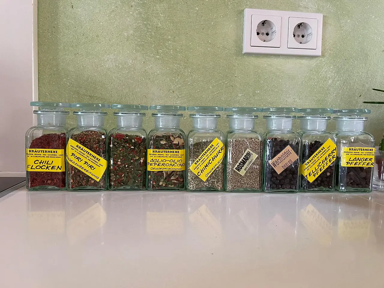 1단계: 먼저 소심하게 집안 양념통 모두 교체- 투명 유리병으로. 원하는 희귀 양념 모두를 재래시장에서 다 구입해서 부엌 찬장을 유리병으로 리노베이션 했다. 그리고 양념통별로 직접 레이블링을 했다.