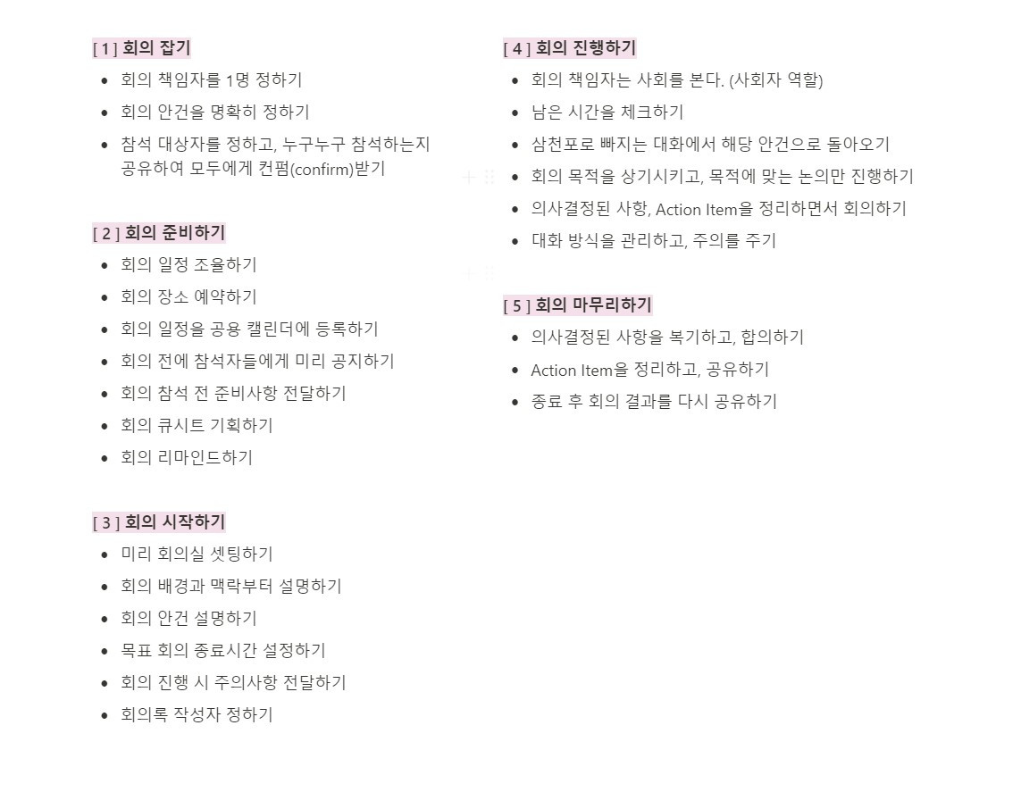 책임자를 정하고, 업무 계획을 컨펌받아 중간 공유하며, 일의 배경과 맥락에 맞게 일하고, 시간 내에 업무 리소스를 배분하며, 히스토리를 기록하고, Action Item을 도출해 일을 추진시킨다. 회의 방법론이 업무 방법론과 다를 게 무엇인가??