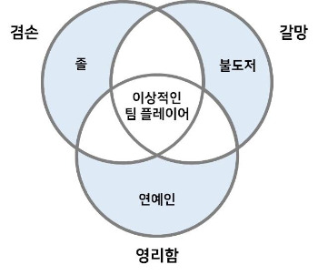 이 세 가지 중에 하나라도 부족하면 좋은 팀 플레이어가 되기 어렵다. 왜 그런지는 한 번 생각해보시라. 겸손하고 일에 대한 욕심도 있는데 대인관계에서 막말하는 사람이라든지, 겸손하고 대인관계도 원만한데 별 욕심 없이 자기 일만 끝내고 집에 가려는 사람이라든지.