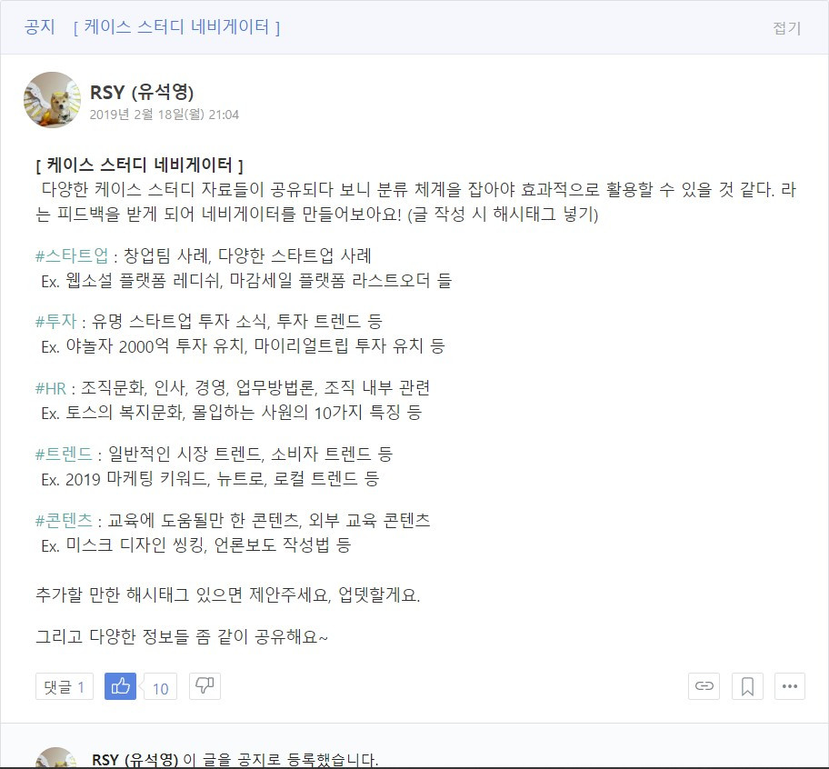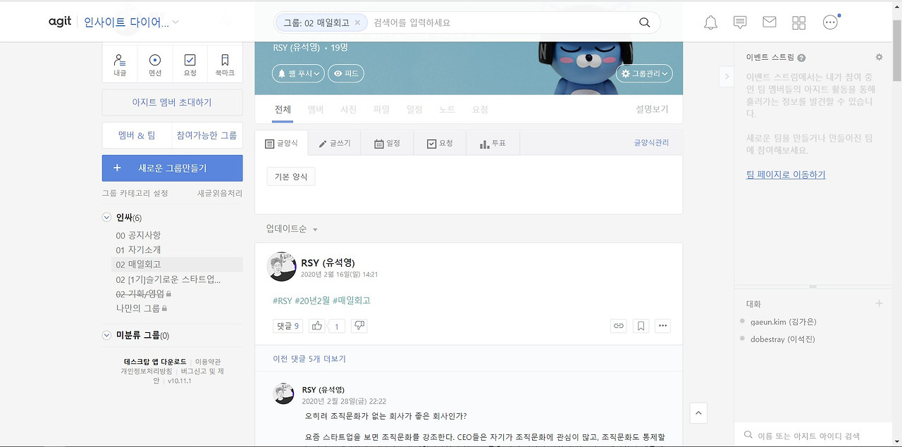아지트는 정보들을 카테고라이징 할 수 있는 장치들을 잘 만들어두었다. 아래 두 가지 장치가 슬랙/플로우와 비교되는 강점이다.