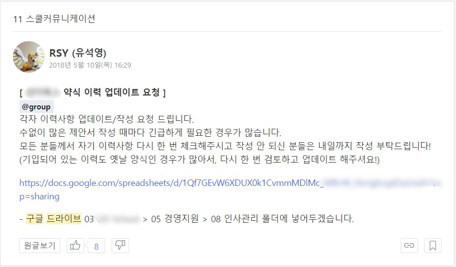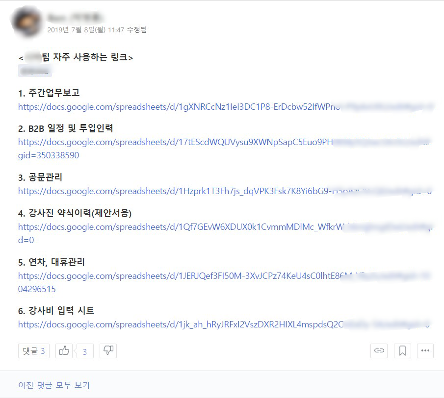 - 파일을 수정하게 되면 반드시 위 경로/링크에 최신 본을 업데이트해놓게끔 규칙을 정해야 한다. 이 규칙이 잘 돌아가려면 평상시 업무 커뮤니케이션 때에 해당 경로에 쉽게 접근할 수 있도록 적어놔야 한다.