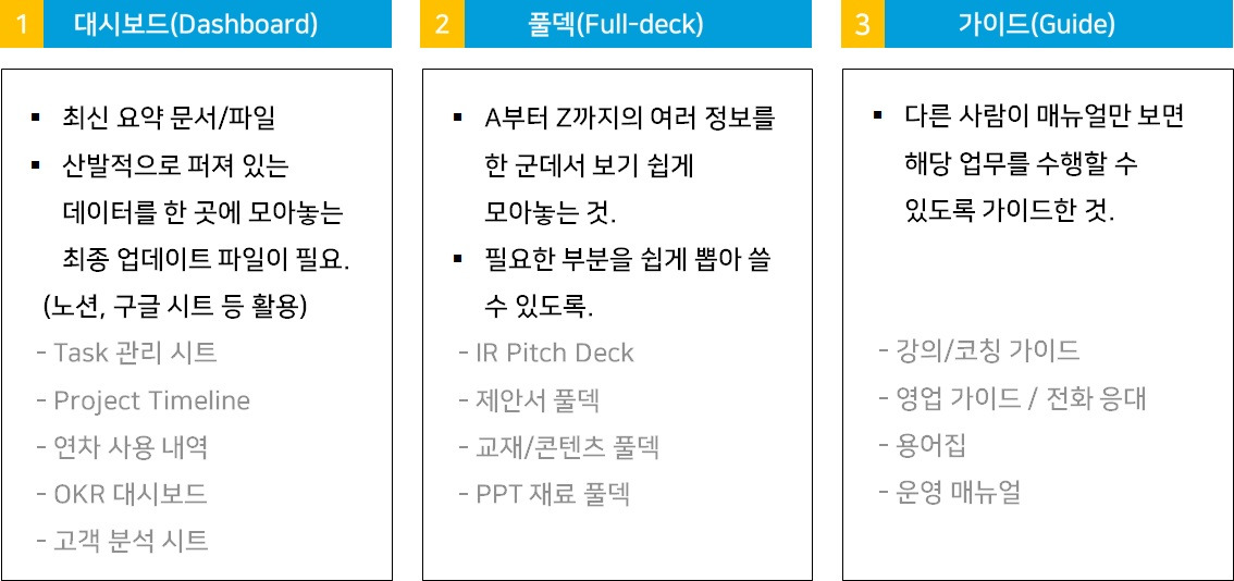 - 의미 : 카드 덱을 만들어서 상황에 맞게 필요한 카드를 꺼낼 수 있도록 만드는 것처럼, 활용 가능한 자원을 모아 하나의 덱으로 만드는 걸 말한다. 매번 정보/자료를 찾기 위해 구글 드라이브를 헤매거나 동료에게 요청하는 게 아니라 풀덱(Full-deck) 파일/폴더 하나만 있으면 원하는 정보를 단번에 찾을 수 있도록 조치한다.