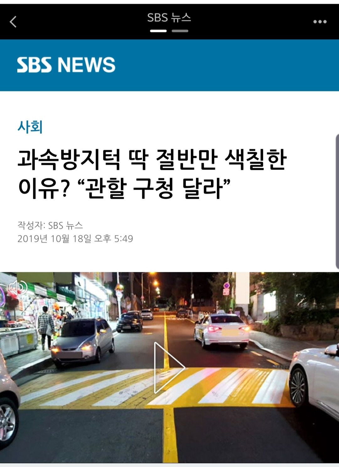 며칠 전 뉴스에서 웃픈(웃기면서 슬픈) 뉴스를 봤습니다. 도로 중앙선을 기준으로 관할구역이 다르다는 이유로 과속방지턱 절반만 색칠했다고 하더군요. (아래 사진)