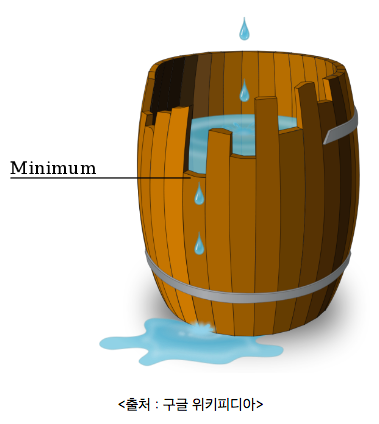 가장 많이 알려진 그리고 쉽게 이해할 수 있는 그림이 바로 <리비히의 물통(Liebig's barrel)>입니다. 물통이 담을 수 있는 물의 양 최대치는 가장 낮은 나무판에 의해서 결정됩니다. 만약 더 많은 물을 보관하고 싶다면 가장 낮은 나무판의 높이를 올려야 합니다.