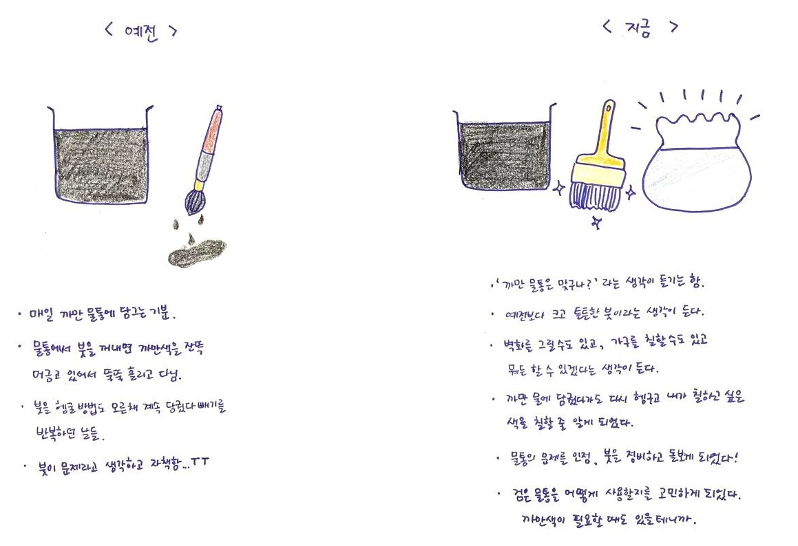 붓이 약해서, 성능이 좋지 않아서 검은 물만 잔뜩 머금고 다른 색은 칠하지 못하는 게 아니라(개인의 탓이 아니라) 그냥 그런 물통에 너무 자주 담가져서(환경의 문제) 그런 거라는 걸 알았으면 좋겠는데...