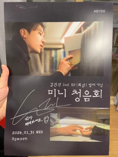 지난주에 저는 아주 속상한 일과 기쁜 일이 교대로 휘몰아치는 역동적인 한 주를 보냈어요. 두 아이가 번갈아가며 독감에 걸려서 집에서도 회사에서도 마음이 불편했고, 여러 가지 책임감에 짓눌려 마치 양쪽에서 누가 내 팔을 잡고 서로 당기는 것 같은 기분에 괴로웠어요. 그런데 그 와중에 또 신기하고 재밌는 경험을 했답니다. 작년 초에 육아휴직에서 복직한 지 1년 된 기념으로 셀프 선물로 혼자 멜로망스 콘서트를 보러 갔었어요. 그 이후로 노래를 좋아해서 즐겨 듣다가 올해 1월에도 또 혼자 공연을 보러 갔고, 그러다 김민석 님이 새 앨범 발매를 앞두고 청음회를 한다는 소식을 알게 되었지 뭐예요. 운 좋게 당첨되어 지난주에 다녀왔답니다. 호호