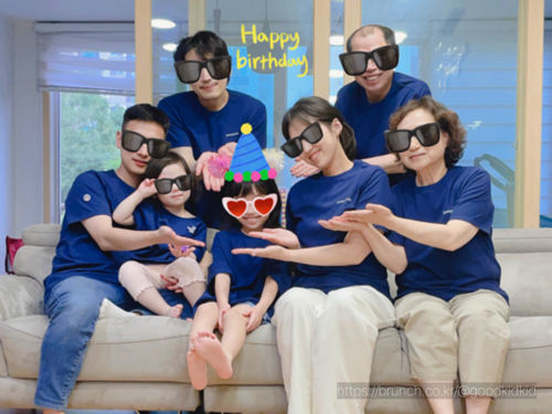 지난 주말, 저희 집에도 사람들이 많이 모였어요. 이번 주에 있었던 첫째 아이 생일을 축하해 주기 위해서 부모님과 오빠가 와주셨답니다. 미리 얘기하지도 않았는데 예전에 맞춘 가족 티셔츠를 챙겨 와서는 다 같이 입고 축하해 주자고 하셨어요. 왠지 모르게 회사 야유회 같기도 하고 '파이팅!'을 외치며 사진을 찍어야 할 것 같은 느낌이 들어 웃음이 터지더라고요. 그렇게 소파에 모두 앉아서 사진을 찍는데 문득, '아 너무 행복하다!'는 생각이 들었어요. 서로 멀리 떨어져 사는데도 이 날 하루만큼은 다 같이 모여서 웃고 떠들고 함께 식사하는 이 풍경이 너무 예쁘고 감사하게 느껴지더라고요. 아이에게도 가장 좋은 선물이 된 것 같아 흐뭇했어요.