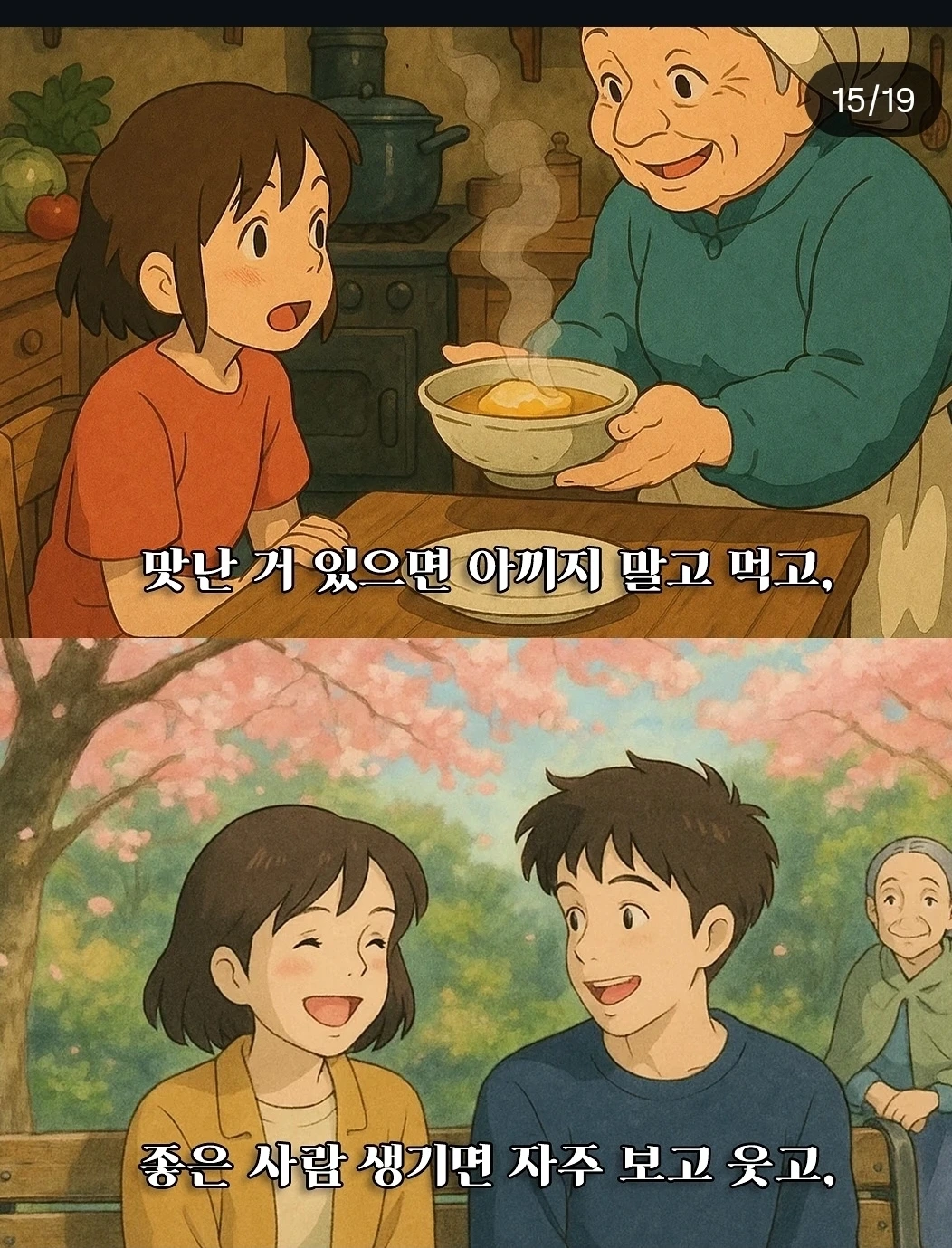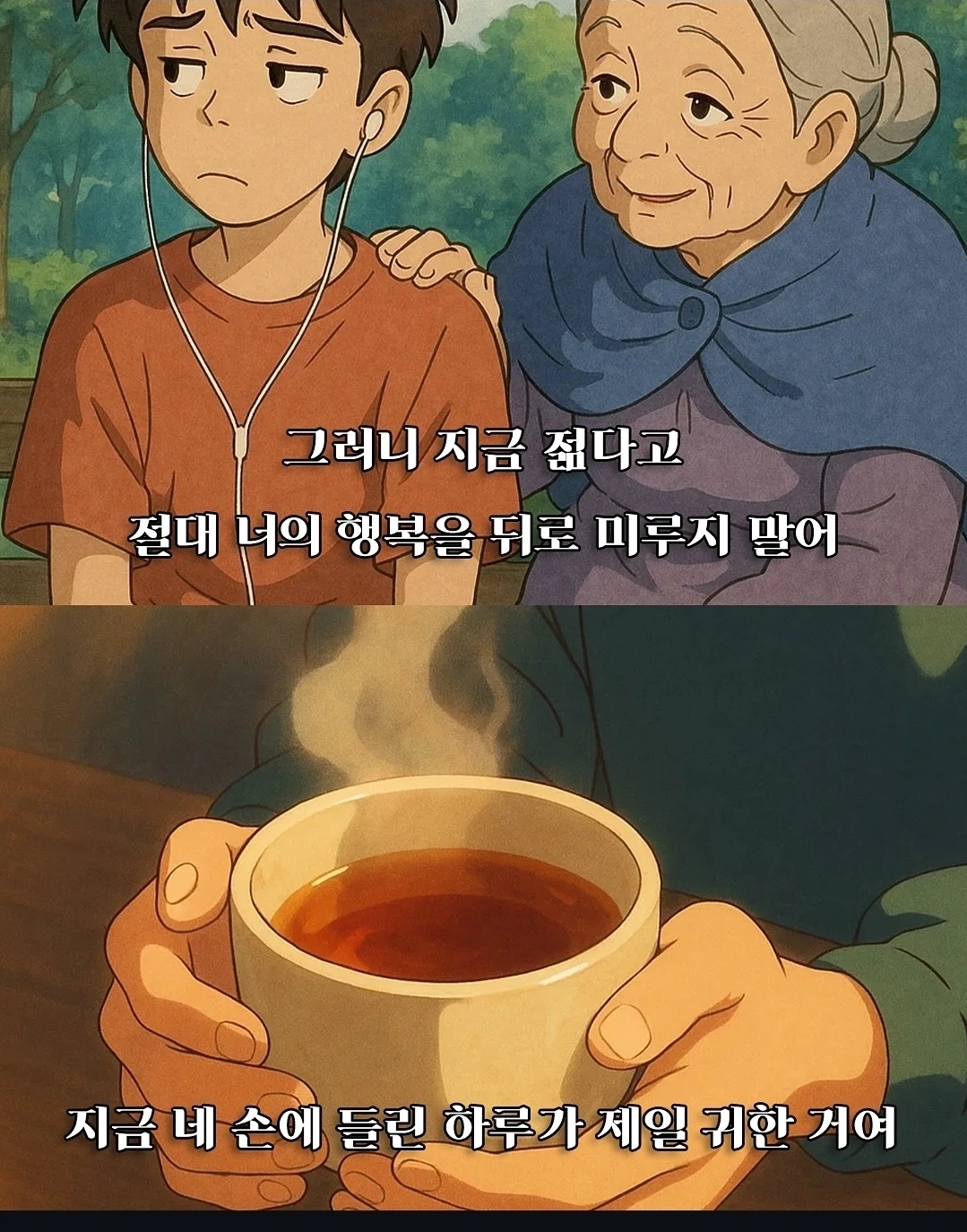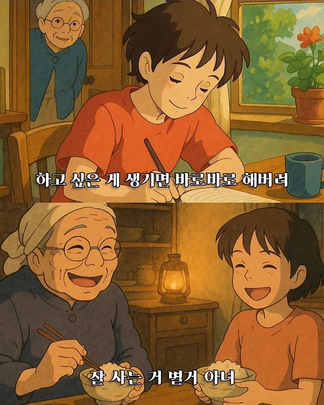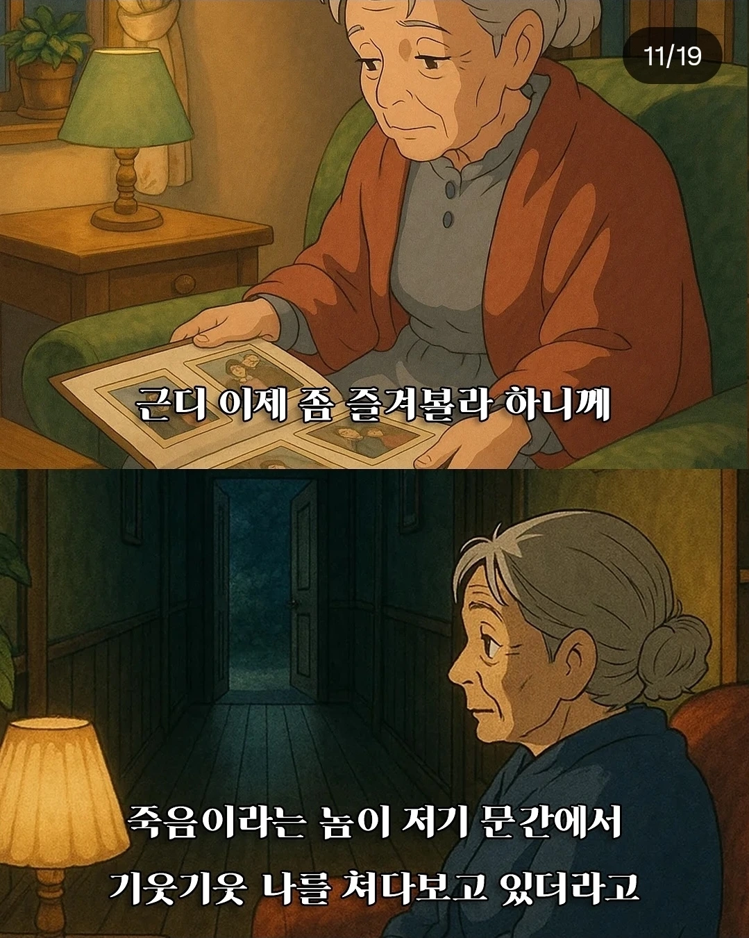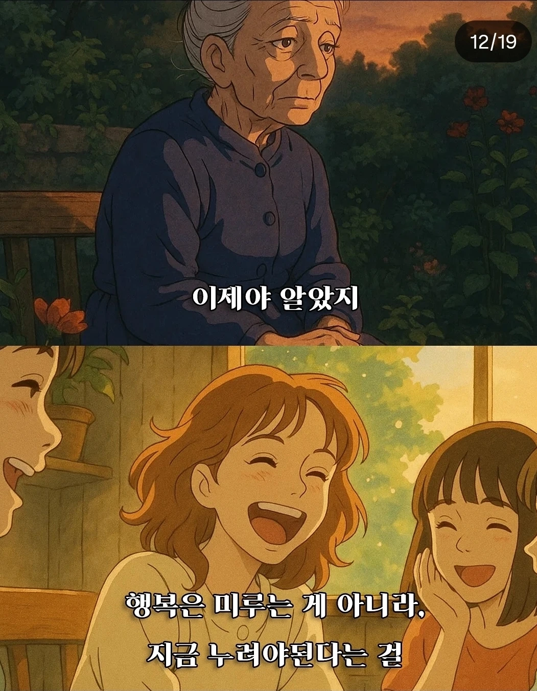 그래서 하고 싶은 건 미루고, 늘 일을 하고 바쁘게 살았지. 근데 이제 좀 즐겨볼라 하니, 죽음이란 놈이 문간에서 기웃기웃 나를 쳐다보더라. 그제야 알았지. 행복은 미루는 게 아니라 지금 누려야 한다는 걸.”