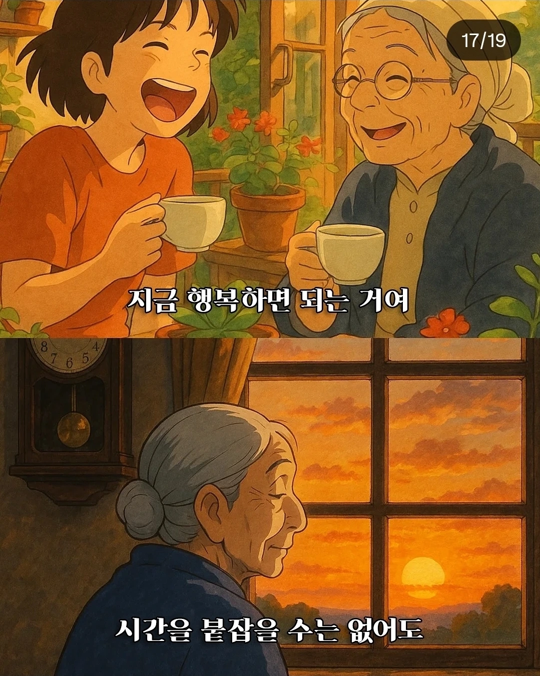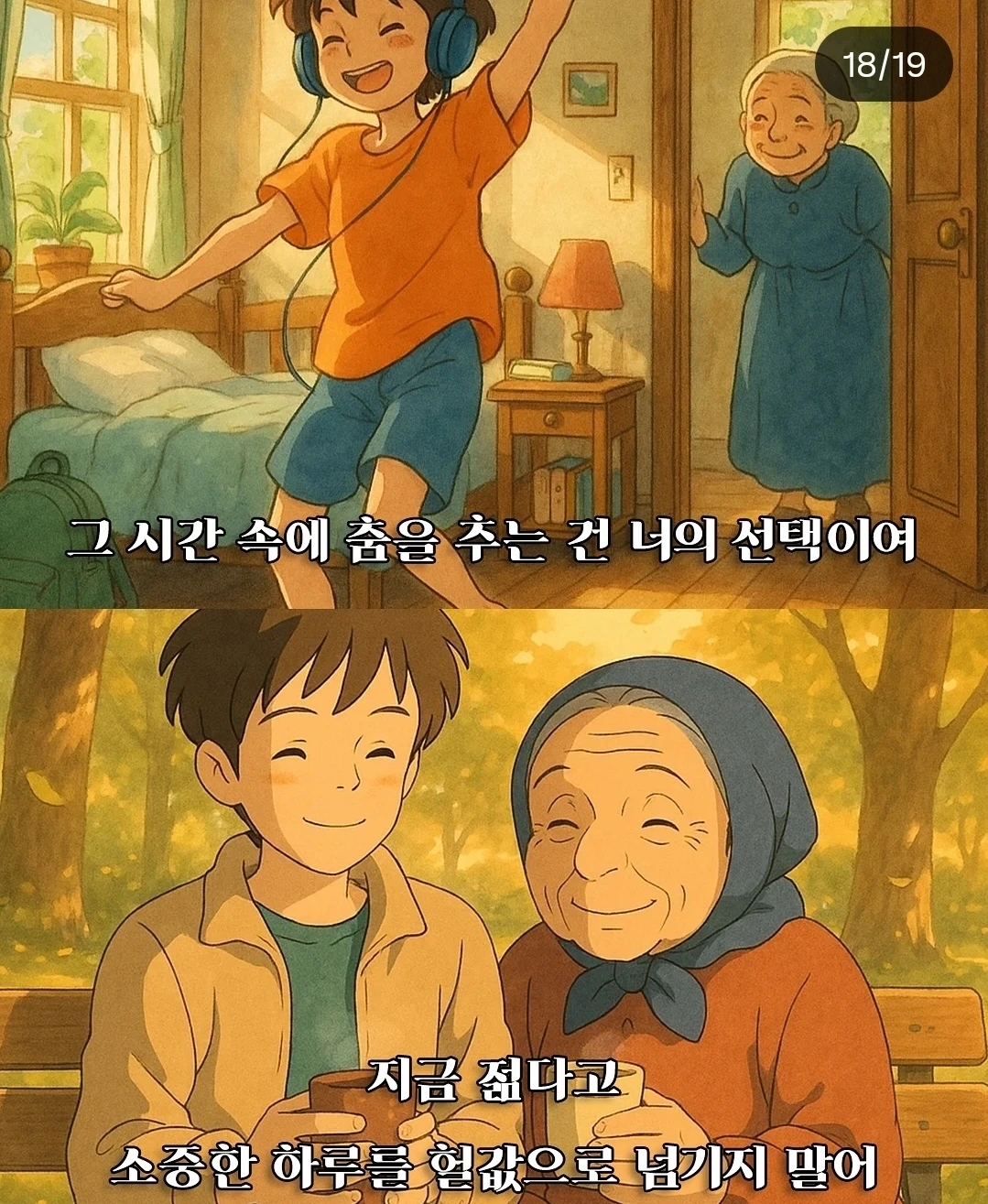 언젠가 우리도 그 할머니처럼, 문간에서 삶을 돌아보게 될 날이 오겠죠. 그때 후회하지 않기 위해 지금 이 순간을 온전히 느끼고, 누리고, 사랑해야 합니다. 삶은 언제나 “지금”이라는 선물 속에서만 존재합니다.