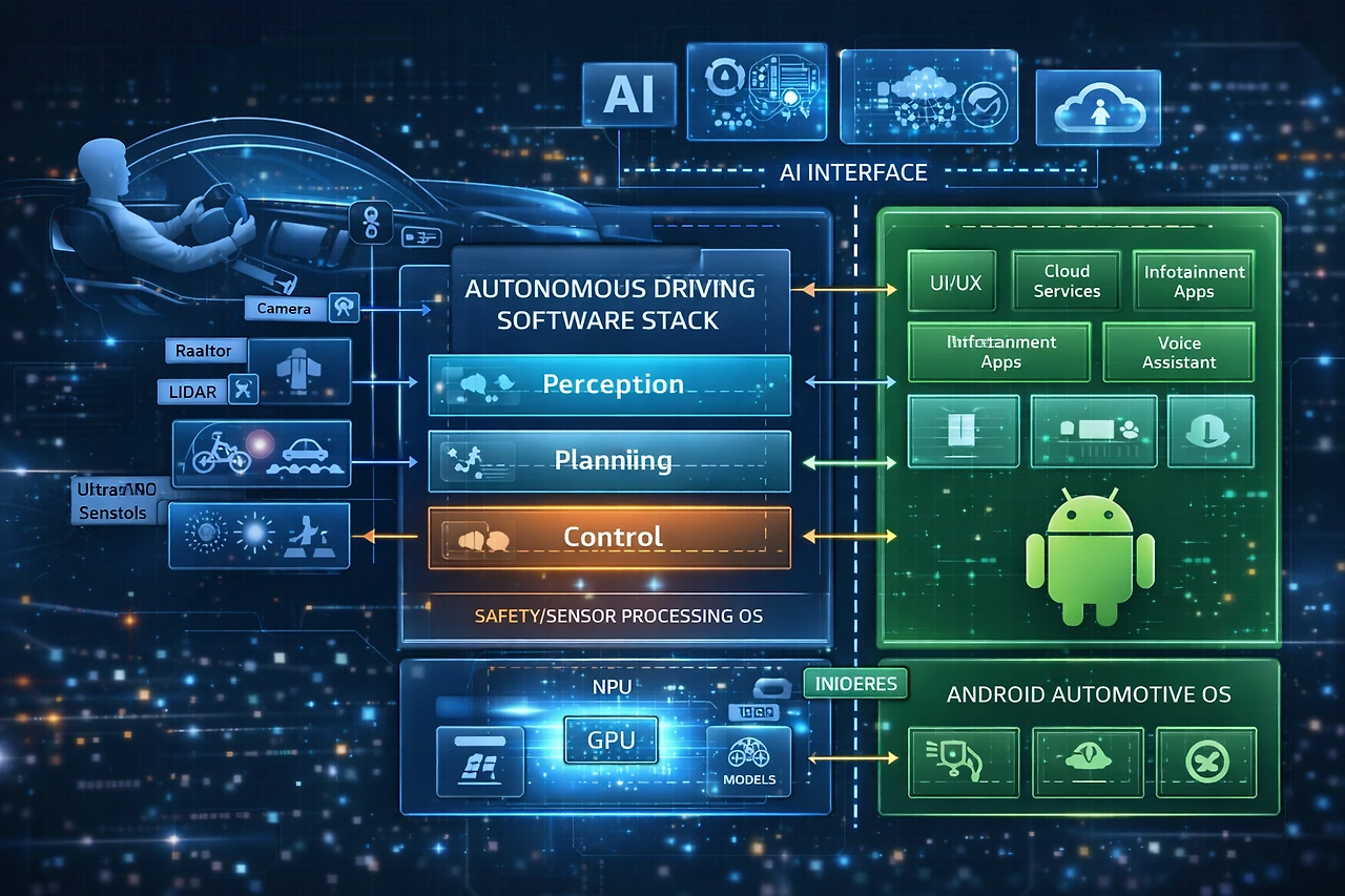 AAOS 위에 자율주행/AI 소프트웨어가 얹힌다는 말은, Android가 자율주행을 직접 담당한다는 뜻이 아닙니다. 오히려 Android는 자율주행이라는 거대한 지능 시스템을 사람에게 이해시키고, 연결해 주는 플랫폼 역할을 합니다.