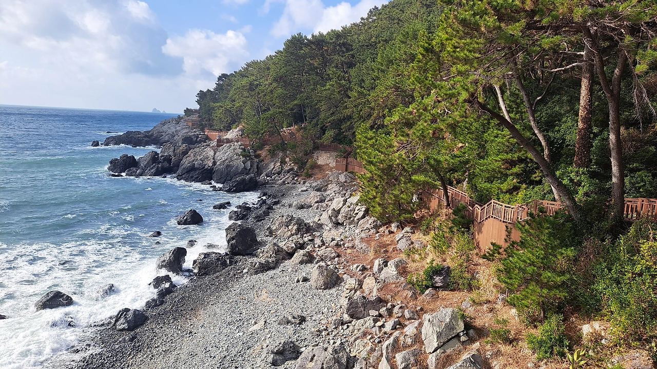 사찰 구경을 마친 후 다시 버스를 타고 "해변 블루라인파크 투어버스' 타는 곳으로 왔습니다. 중간 전망대 코스에서 내린 후 주변경치(발아래는 유리로 되어, 바다가 밑에서 보이는) 보고 사진도 찍고 시간을 보냈습니다.
