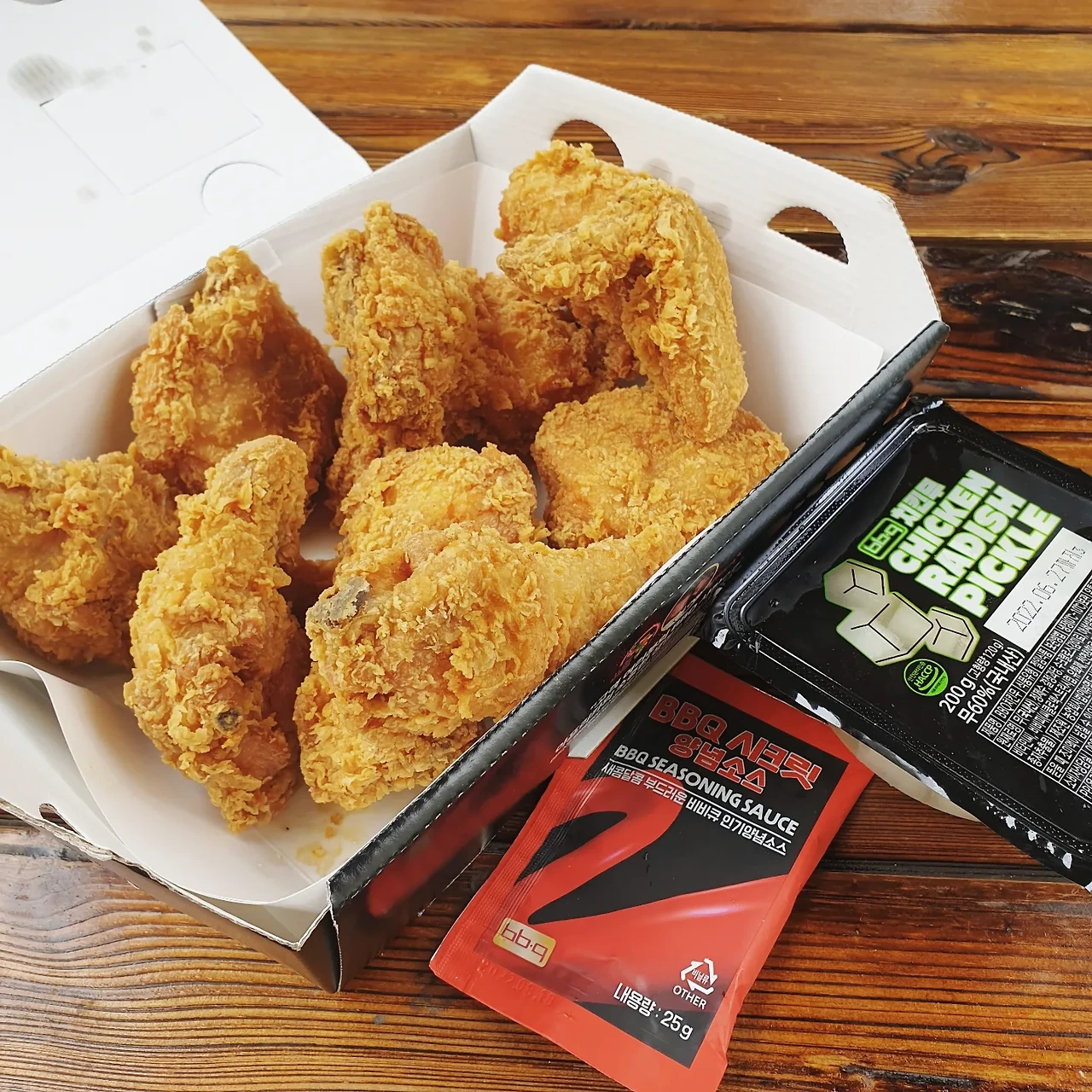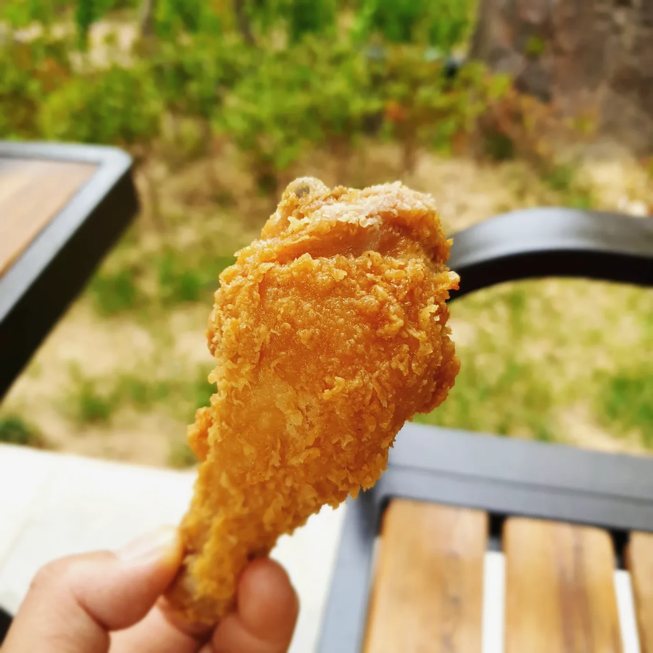 치킨을 받아들고 집으로 가다가 아파트 단지 안에 있는 야외 테이블 앞에 멈추어 섭니다. 같은 음식이라도 집에서 먹는 음식보다는 야외에서 먹는 게 훨씬 맛있잖아요? 평소에는 건강을 생각해서 먹는 시늉만 하던 치킨을 신나게 먹어줍니다. 건강을 위하는 것도 좋지만 어차피 먹을 거 기분 좋게 먹었더니 완전 꿀맛이네요. 어린 시절에 먹었던 치킨 맛이 그대로 살아나는 듯합니다.