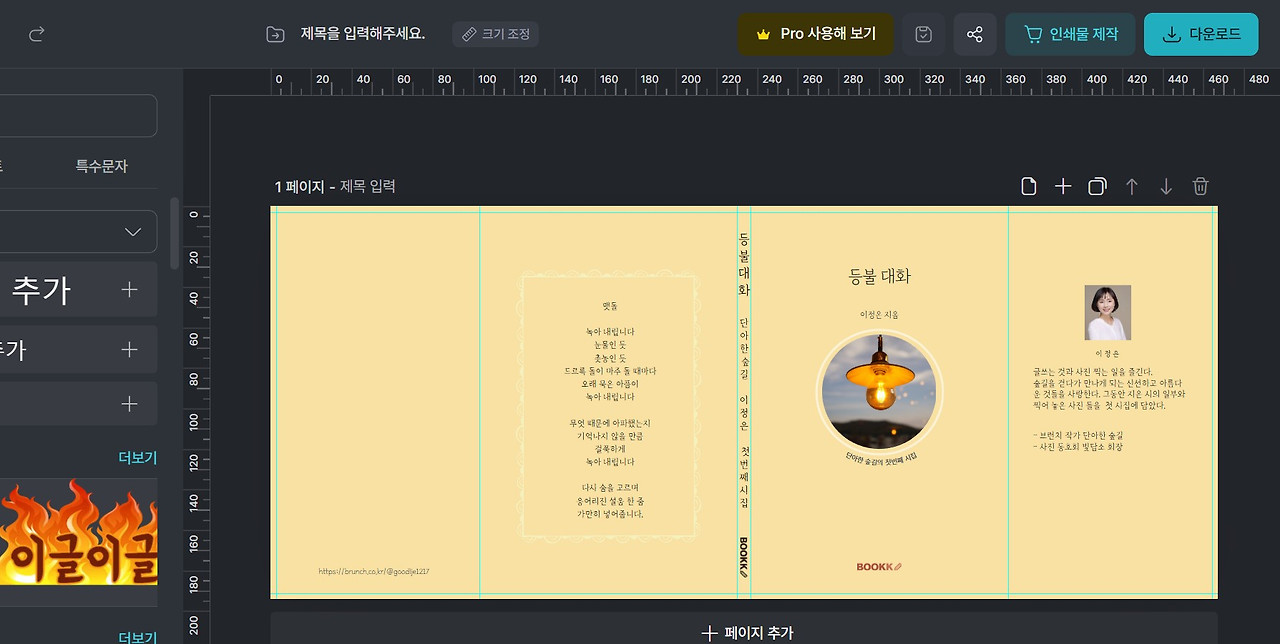표지를 디자인 전문가에게 맡길까 고민하다가 결국은 미리캔버스로 직접 만들었다. 기본 디자인을 한 후 지인들에게 디자인에 대한 의견을 물어보았고 조언을 참고해서 다듬은 결과물이다. 이 정도면 무난한 것 같다. 내지 편집도 직접 했다. 처음 하는 작업이고 경험이 부족하기에 그냥 심플하고 깔끔하게 하려고 노력했다.