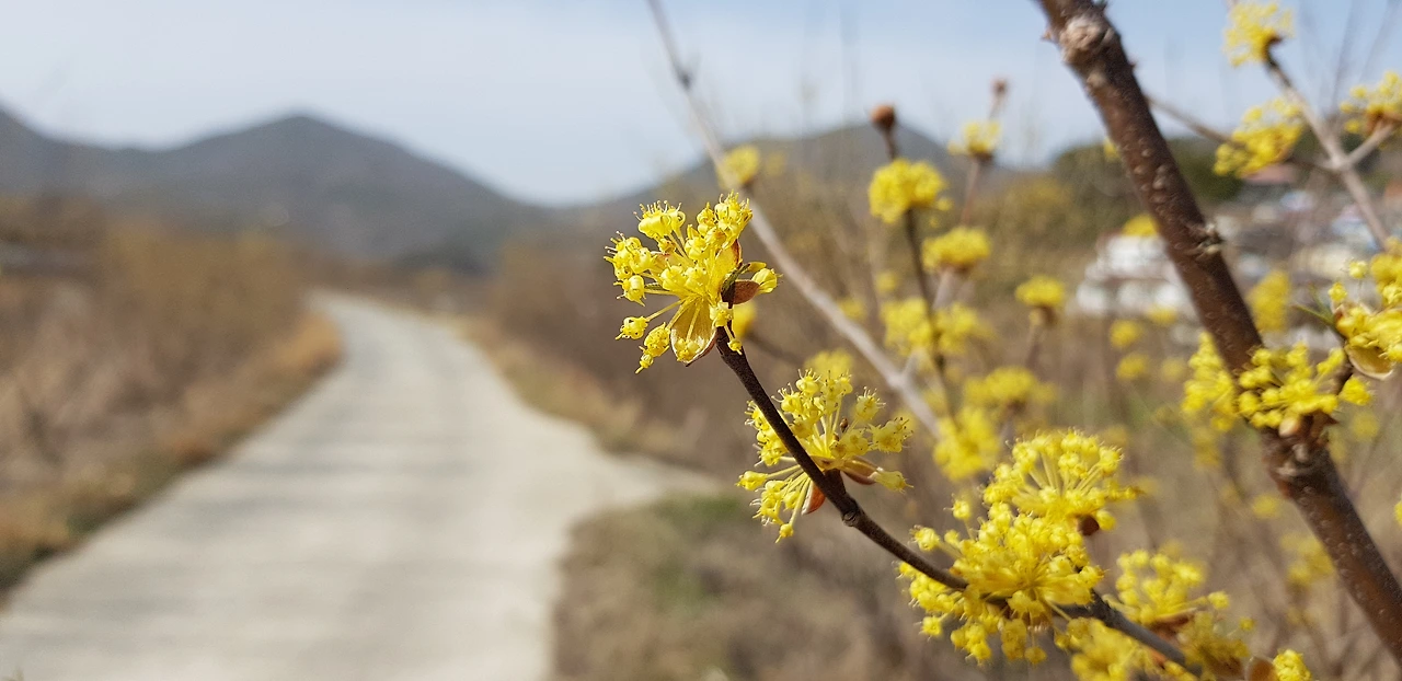 누가 이렇게 산수유나무를 논밭 옆 긴 길을 따라 심어놓았을까? 여유로운 작은 시골마을에 멋스런 운치를 더해주는 것 같다.