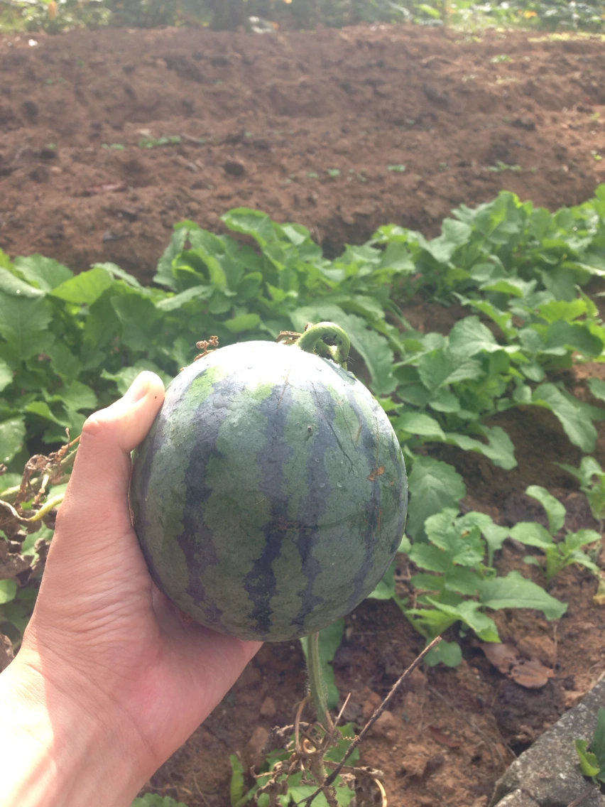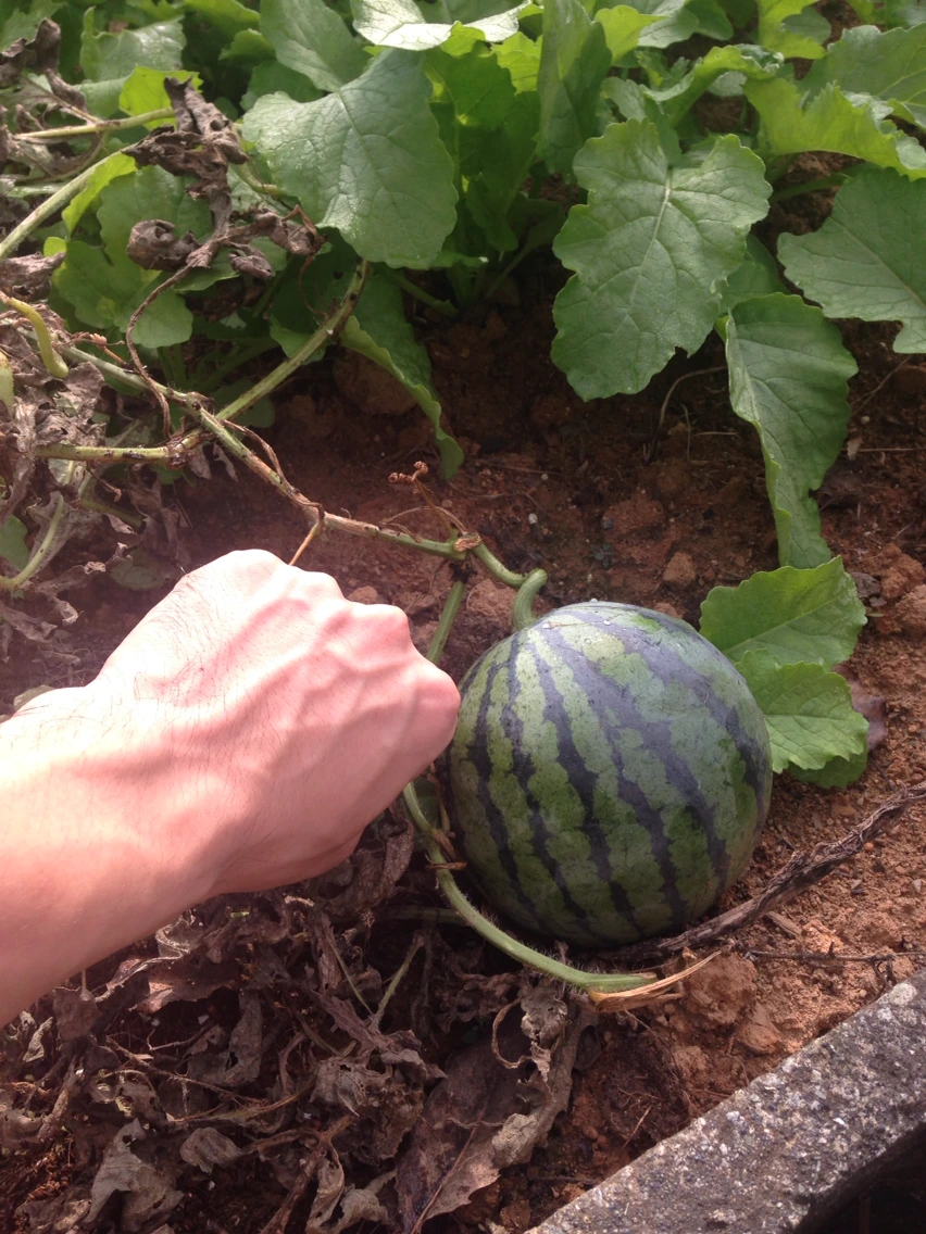 텃밭 사이에 주먹만 한 크기의 수박이 열린 것이, 뜻하지 않은 만남은 반가웠다.