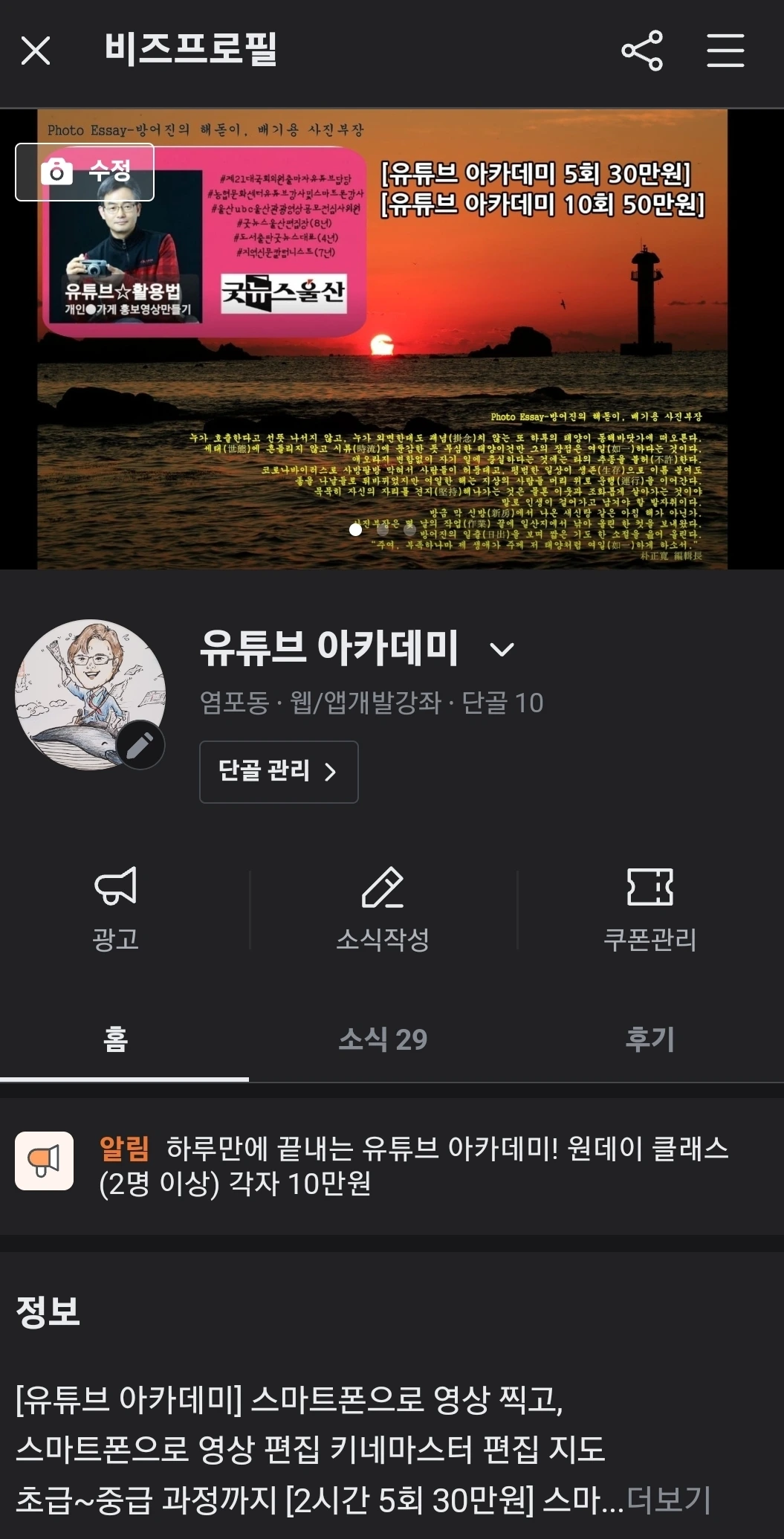 유튜브 아카데미 원데이 클래스 [개인당 10만원]