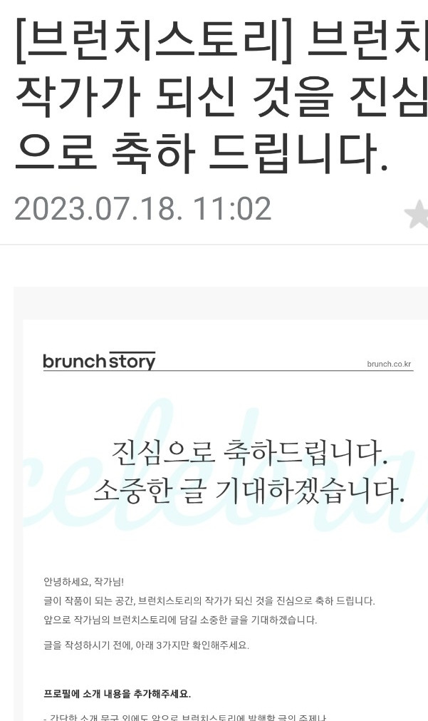 올해 기쁜 일 중에 빠질 수 없는 것이 브런치 작가가 된 일이다. 언젠가 걷기 밴드 리더가 브런치 작가 신청을 했는데 몇 번 떨어졌다고 했다. 계속 도전할 것이라고도 했다. 그저 작가라는 말이 나하고는 감당치 못할 타이틀이라 생각했다. 그때만해도 브런치가 무엇을 하는 곳인지 몰랐다. 흘려 들었다. 그런데 글쓰기 인연이 자연스럽게, 저절로 이어졌다. 브런치에 신청을 했고 2023. 7.18. 11:02. 합격했다는 연락이 왔다. 그 어떤 것 보다도 기뼜다.