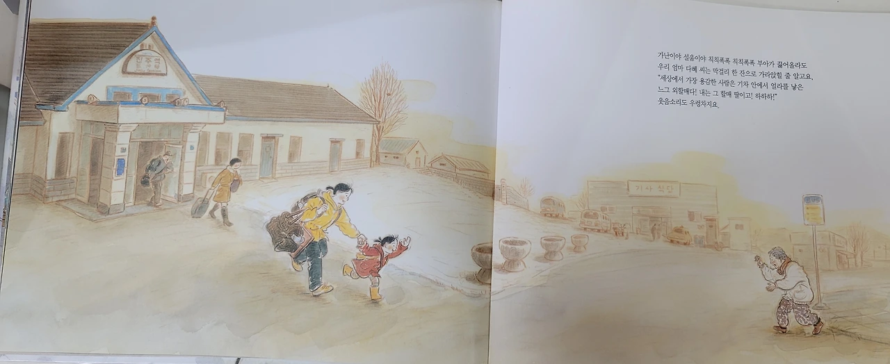 마지막 그림에서 엄마 손을 잡고 역사를 걸어 나오는 아이 앞에 할머니가 두 손으로 환영하는 모습이다.