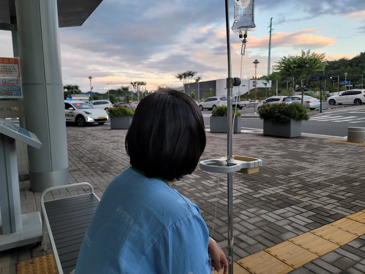 수술하고 하룻밤을 보내고 이튿날 태풍이 지나가고 조금 시원해지자 병원 앞에 나와 앉아 있다.
