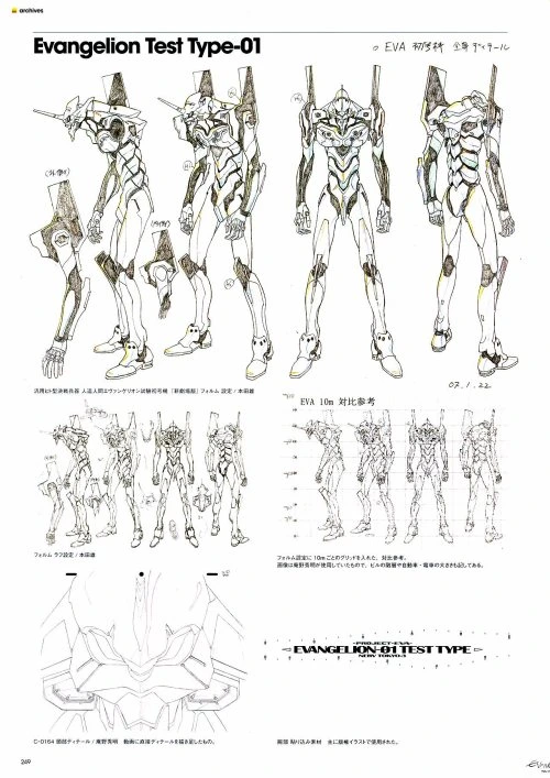 7. "일본에 오니라는 괴물이 있습니다. 이 괴물의 머리에는 2개의 뿔이 튀어나와 있는데 에바의 전체적인 이미지는 그것을 기반으로 하고 있습니다. 또한 이 '로봇 괴물'의 내부가 그다지 복잡하지 않다는 인상을 주고 싶었습니다. 로봇이지만 거대한 인간입니다."