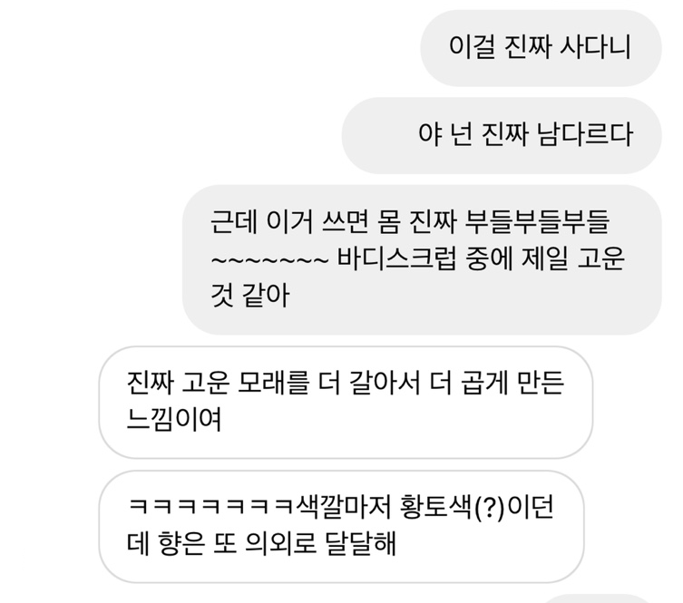 나름 올리브영 1위라는 다른 제품도 써봤는데 다른 제품들은 놀이터 모래에다가 몸을 비비는 느낌이라면 이거는 고운 모래사장에 몸을 비비는 느낌이다.