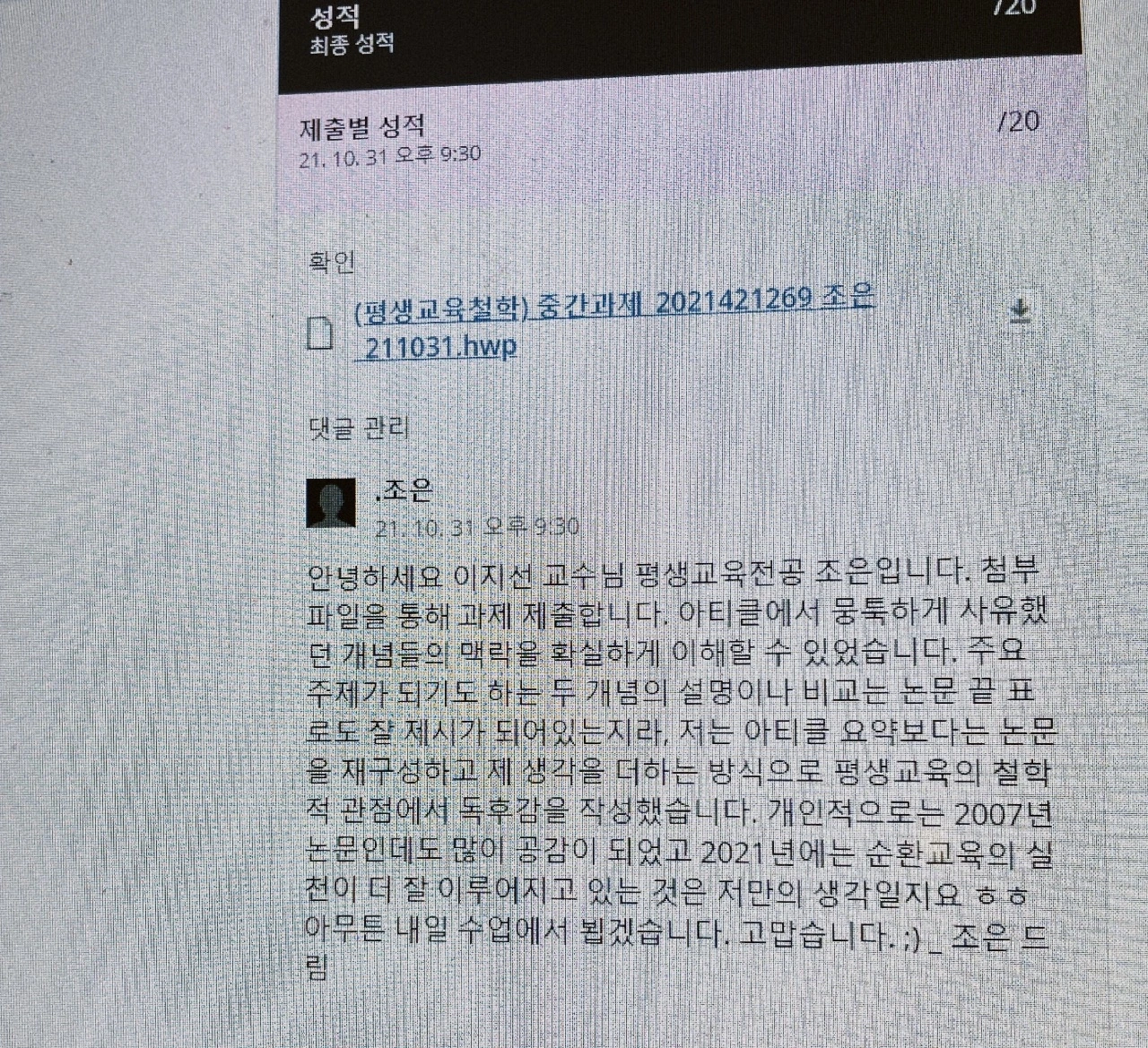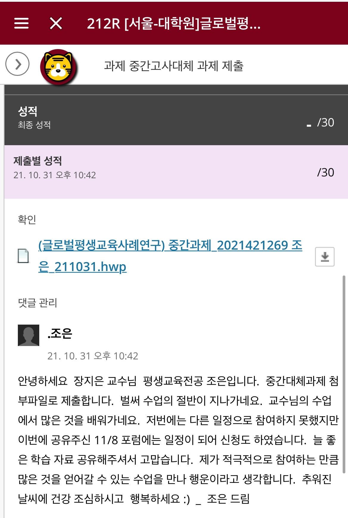 짜식, 멋지게 중간고사 과제도 모두 제출하고,