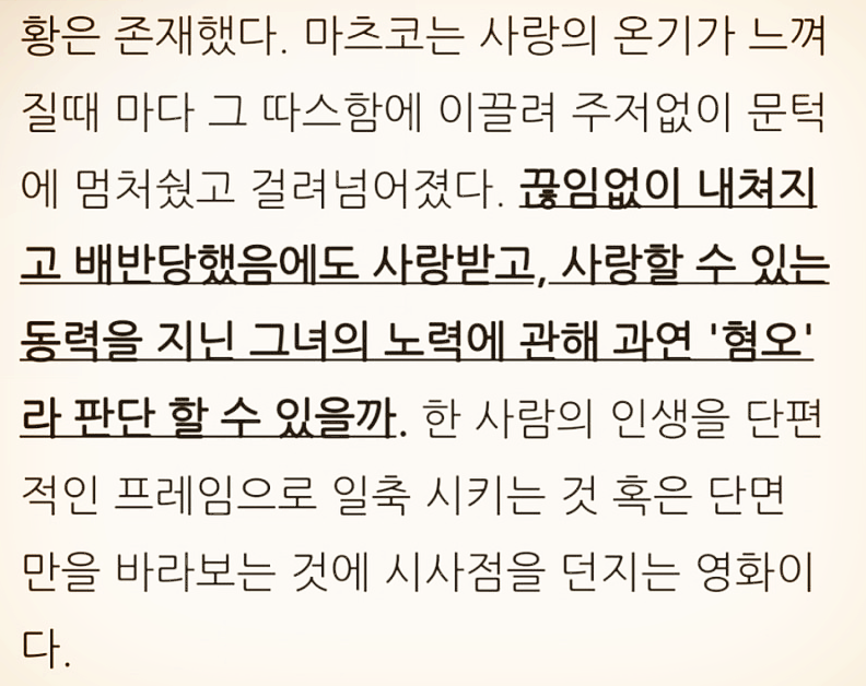 혐오의 본질은 ‘이 상태로는 사랑 받지 못할 것’이라는 데에 대한 반작용이기도 하단다. 우리 사회가 자꾸 가지지 못한 것만 보게 만드는데 그럼에도 누구나 자기만의 사랑을 할 권리와 책임이 남아있다는 게 우리 시대 최대 낭만인건가. 그것 역시 개인의 선택의 영역으로 남겨둔다는 게 한편으로는 또, 말을 줄인다.