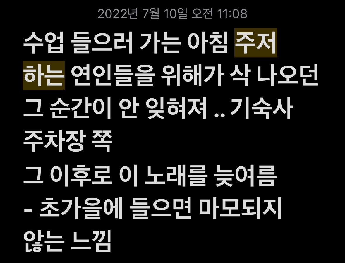 이걸 이 노래를 시험기간에 듣던 그 때 느낀 건 아니다. 오히려 그 때까지도 이 노래의 가사를 정확히 잘 몰랐다. 그냥 정말 필로 들었다. 느낌이 좋았다.