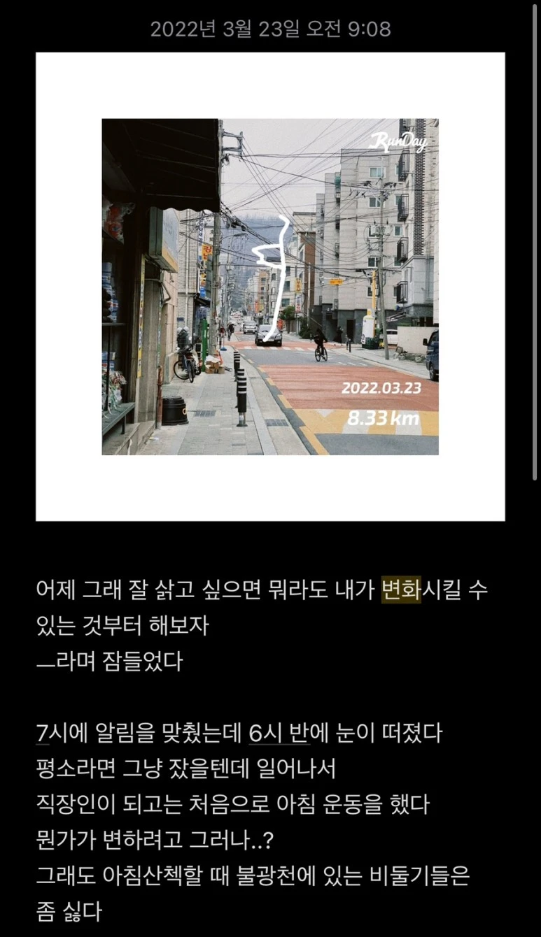 2022년 어느 날의 일기를 보는데 변화나 의미는 세상이 주는 게 아니라 내가 알아차려야 하는 거, 가져야 하는 거라는 생각을 다시 한번 한다. 이런 날도 지나가고, 그런 날도 지나간다.