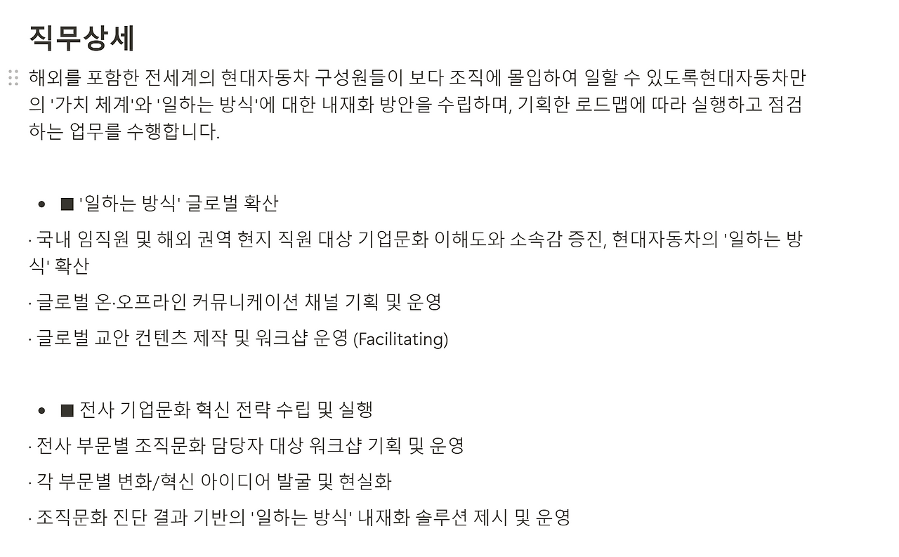 이제는 사내 에자일 코치나 사내 퍼실리테이터, 퍼실리테이션 역량을 갖춘 HRD 담당자를 두는 것이 좋은 조직문화를 가진 기업의 조건으로 꼽히고 있습니다. 특히 이러한 역량의 트렌드와 역할은 Job description을 통해 확인할 수 있는데, 2024년 상반기에 올라온 현대자동차 인재개발 JD를 먼저 살펴보겠습니다.