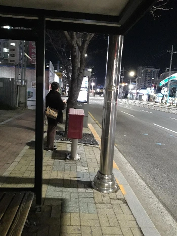 정류장에서 차가 오기 전에 돌아서 가는 사람.