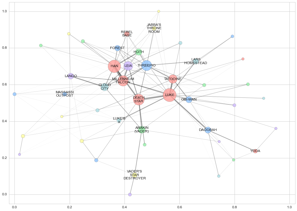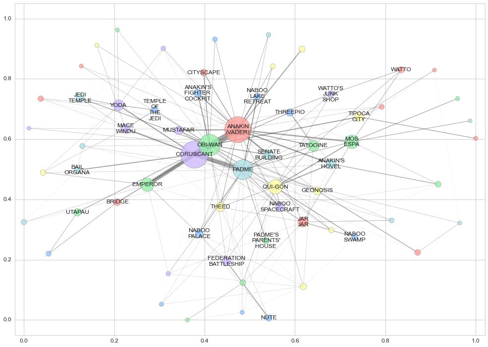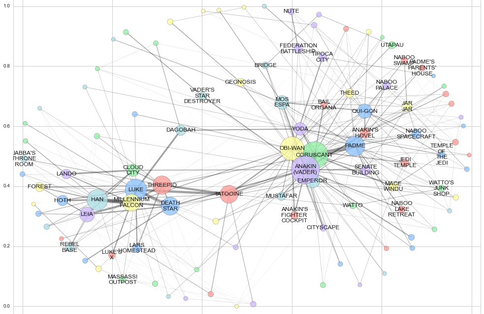 인물과 배경의 연결성을 알아보기 위해 네트워크에서도 위의 인물/배경 유사도 Matrix와 유사하게 아래 네트워크에서도 오리지널 트릴로지(왼편)와 프리퀄 트릴로지(오른편)의 인물 배우 간의 연결고리가 적고, 프리퀄 트릴로지의 네트워크 복잡도가 높은 성향이 동일하게 나타남을 볼 수 있다. 그리고 이 네트워크를 유심히 보면(그냥 봐도) TATOOINE 행성은 각각의 트릴로지를 연결하는 매개체 역할을 훌령히 수행함을 알 수 있다.