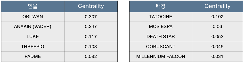 그래프 네트워크에서 Node들의 매개 정도의 중심성을 측정하는 Betweeness Centrality(매개 중심성)를 보면 인물 쪽에는 OBI-WAN, 배경 쪽에서는 TATOOINE 행성이 가장 높음을 볼 수 있다.
