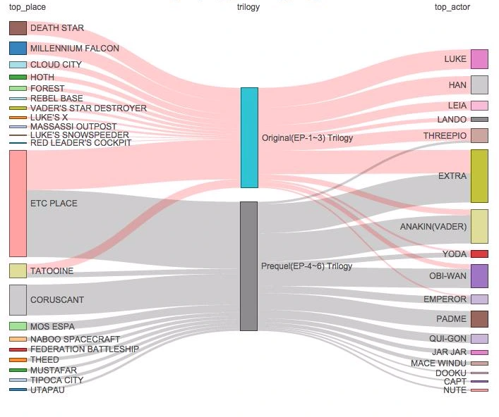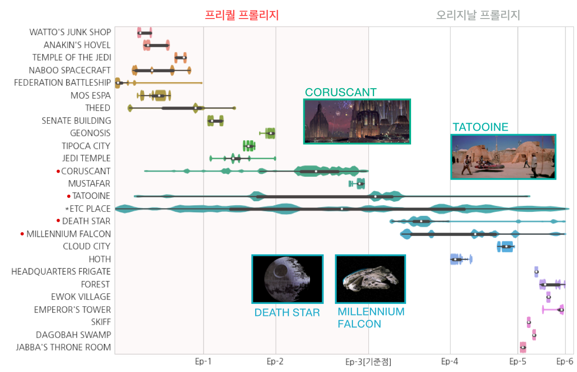 일반적으로 인물/배경 모두 오리지널과 프리퀄 트릴로지 중 한쪽에 편향되어 분포가 이루어지는데, TATOOINE행성은 적절히 2개의 트릴로지 모두에 분포되어 있음을 볼 수 있다. (차트에서는 Original에 좀 더 치우쳐 보이지만, MOS ESPA가 TATOOINE행성의 수도임을 감안하면 비슷한 비율로 중요도가 있다고 보여진다.)