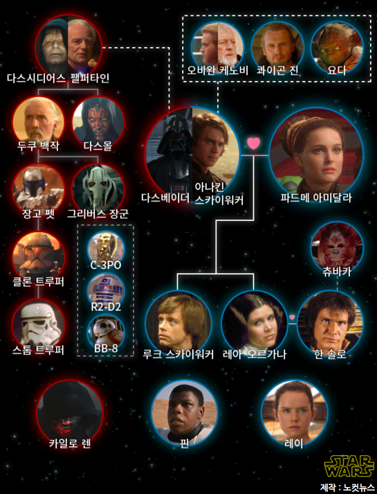 우선 시작하기에 앞서, 개인적으로 스타워즈 스토리는 범우주적 스케일의 스카이워크 집안 3세대의 막장 이야기가 아닌가 하는 생각이다. 그래서 이 포스팅의 분석은 스카이워커 1세대 이야기인 프리퀄 트릴로지(Episode 1~3)와 스카이워커 2세대 이야기인 오리지널 트릴로지(Episode 4~6)의 대비 점을 영화 배경과 인물의 관계 중심으로 분석해 보고자 한다. 혹시 스타워즈 인물 간의 관계를 잘 모르시는 분은 아래 가계도를 참고하셈~