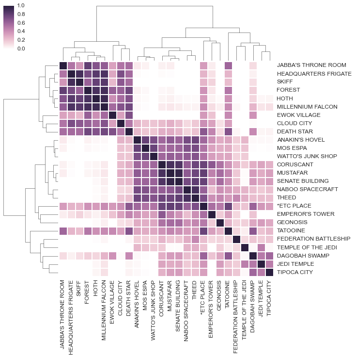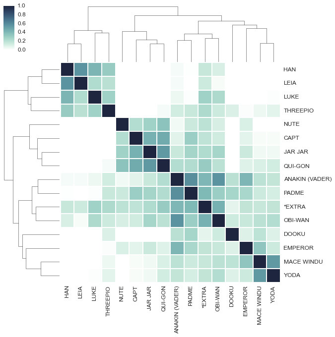 예상했던 것보다 더 명확히 각 트릴로지가 분리되고, 오리지널 트릴로지에 등장하는 luke, leia, han, threepio (왼쪽 상단)가 강한 유사도로 군집화되고, 중심부터 오른쪽 하단까지 프리퀄 트릴로지의 배우들이 소소히 성향별로 군집화됨을 볼 수 있다.