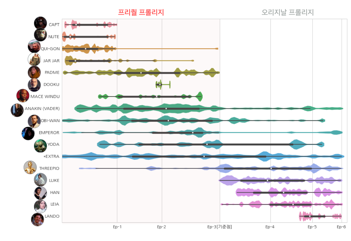 인물들의 출연/대사 빈도를 통해 보면 프리퀄 트릴로지(Ep.1~3)에서는 스카이워커 1세대인 ANAKIN, PADME 그리고 OBI-WAN, PADME, YODA가 오리지널 트릴로지(Ep.4~6)에서는 스카이워크 2세대(ANAKIN+PADME의 쌍둥이 남매)인 Luke, Leia, Han(Solo)가 이야기의 중심임을 볼 수 있다.