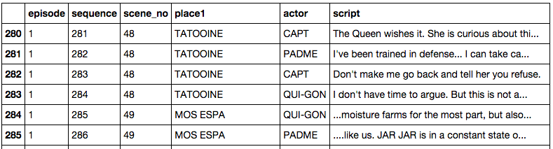 먼저 데이터 랭글링 작업, 영화 대본은 IMSDB 사이트에서 제공하는 스타워즈 Episode 1~6까지 대본 문서를 사용하였다. 이 대본에서 "Scene_no(장면번호), place(배경), actor(배우), script(대사)"의 항목을 추출하는 데이터 파싱, 클린징, 필터링 작업 수행했다. ( 어떻게 6개의 Episode의 텍스트 포맷이 모두 다를 수 있는지 짜증이 쪼매 났다. )