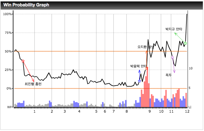 아래 기대 승리 확률 그래프를 봐도 LG는 9회를 사작할때 기대 승리 확률은 5%가 채 되지 않았고 그래서 모든이들이 한화가 이길것으로 생각하고 있었다.
