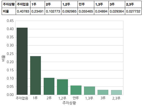 아래 표를 보면 실책은 60%가 주자가 있을때 발생된다. 아무래도 주자를 신경쓰면서 수비를 하다보니 실책이 많이 발생되는가 보다. 여기서 득점권 상황(2,3루 주자)에서의 실책는 거의 실점으로로 연결된다.
