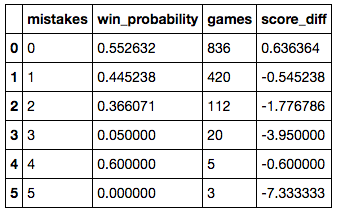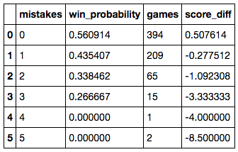 실책을 하지 않았을 때는 0.55(55%)로 중간인 0.5보다 5% 정도 높다. 그런데 실책이 하나 늘어 날마다 10%씩 승률이 감소하고, 3개 이상 실책을 하고 승리를 바란다면 도둑놈이 아닐까 라는 생각이 든다.
