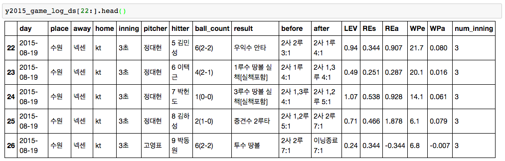 스탯티즈에서 제공하는 2015 시즌, 2016 시즌의 프로야구 경기 로그를 크롤링하여 아래와 같이 경기의 상황별 로그를 수집하고 result column에 내용에 따라 "실책", "안타", "아웃", "진루", "기타"로 분류하여 분석을 하였다.
